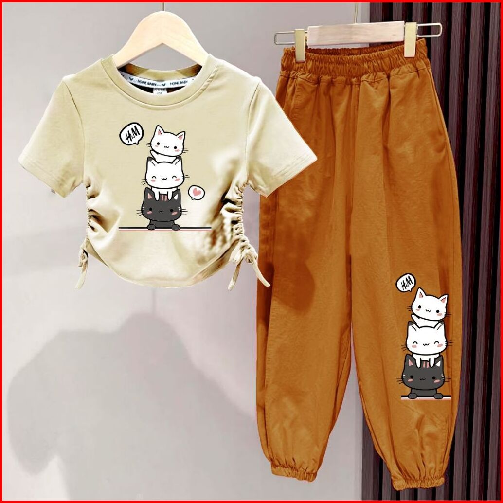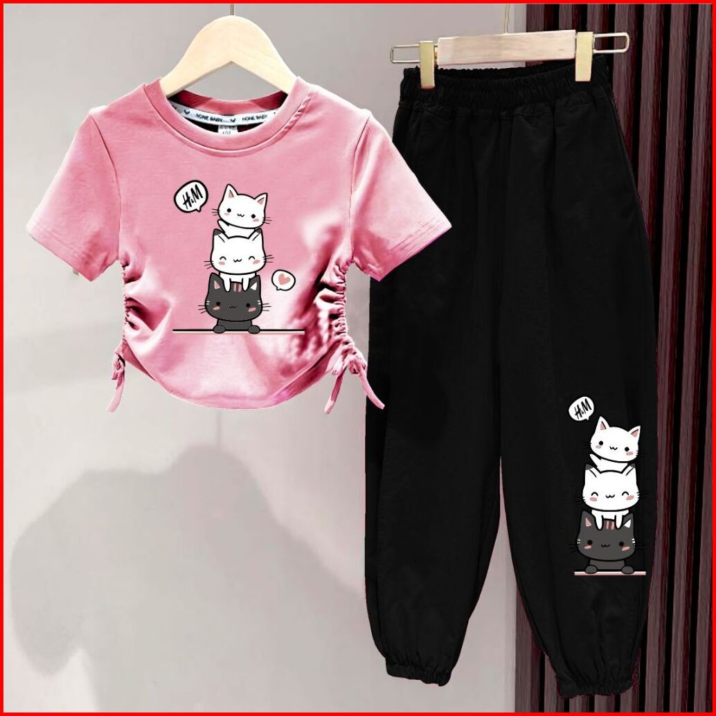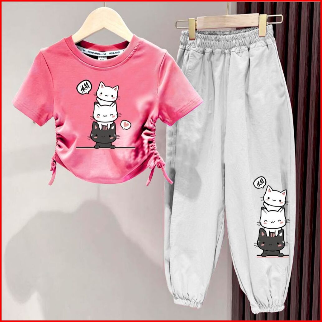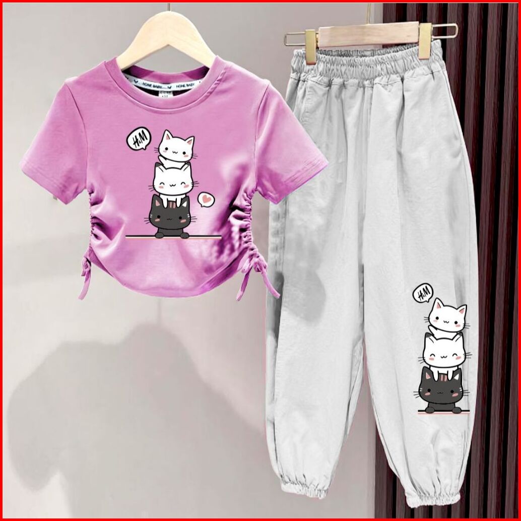 Setelan Anak Perempuan Model Kaos Serut Pinggir Celana Jogger Anak Perempuan Umur 1 - 12 Tahun Bahan Katun 30s