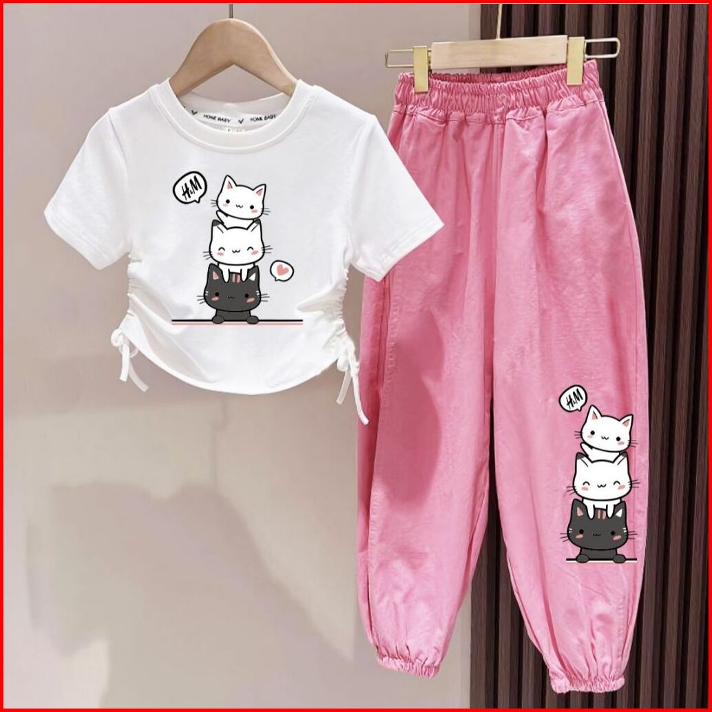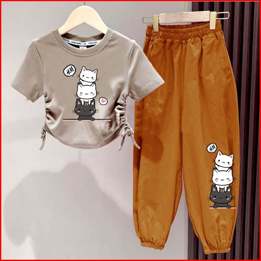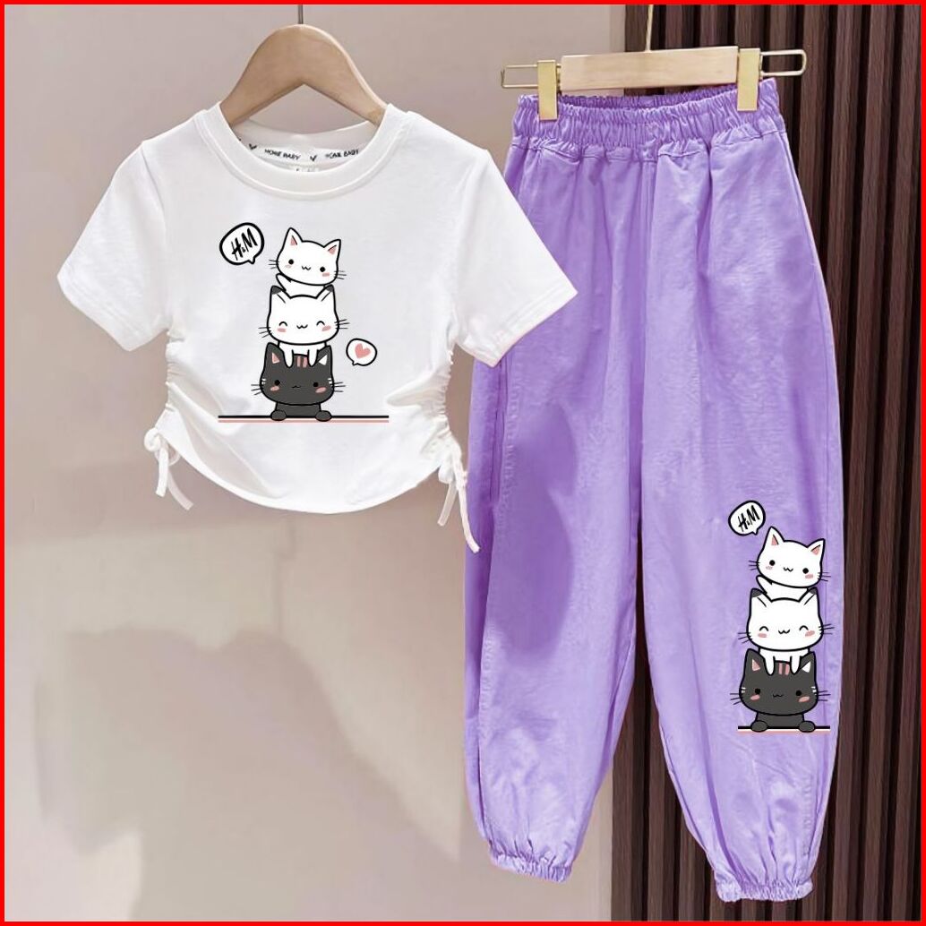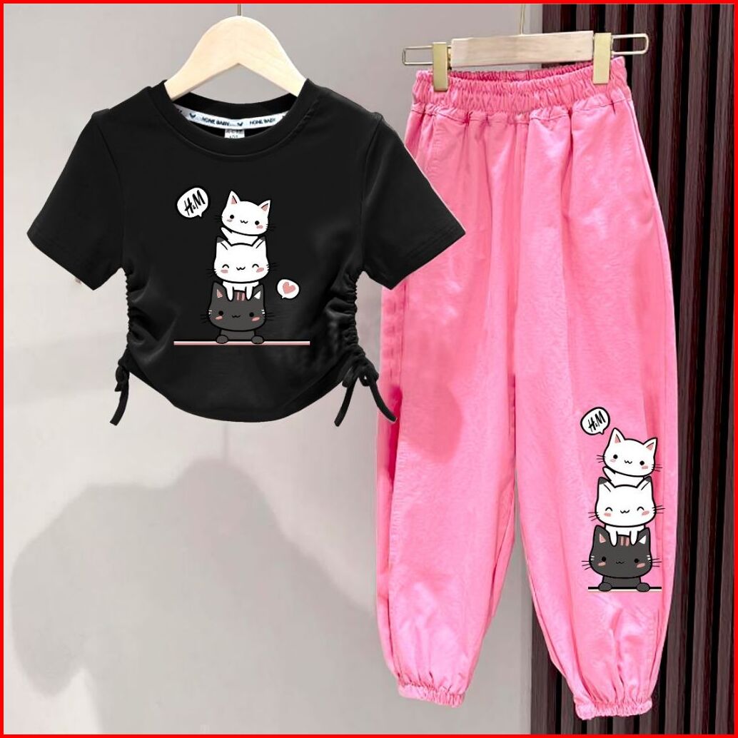 Setelan Anak Perempuan Model Kaos Serut Pinggir Celana Jogger Anak Perempuan Umur 1 - 12 Tahun Bahan Katun 30s