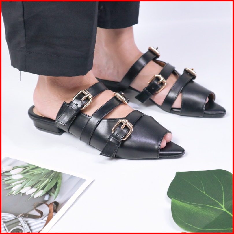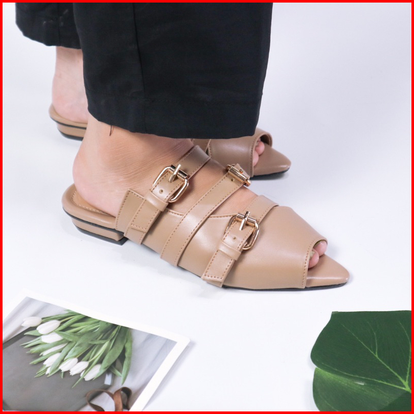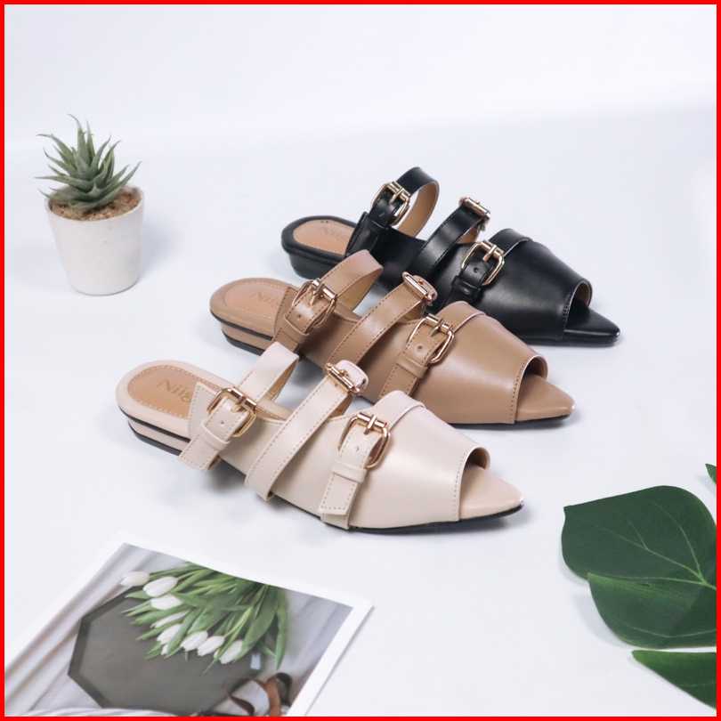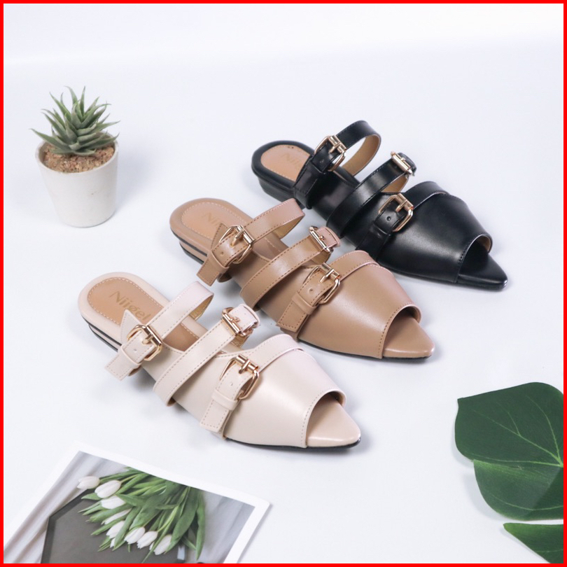Niigel - Ardelia Sandal Flat Wanita Kekinian Hak 2cm Variasi Gesper Model Runcing 3 Warna