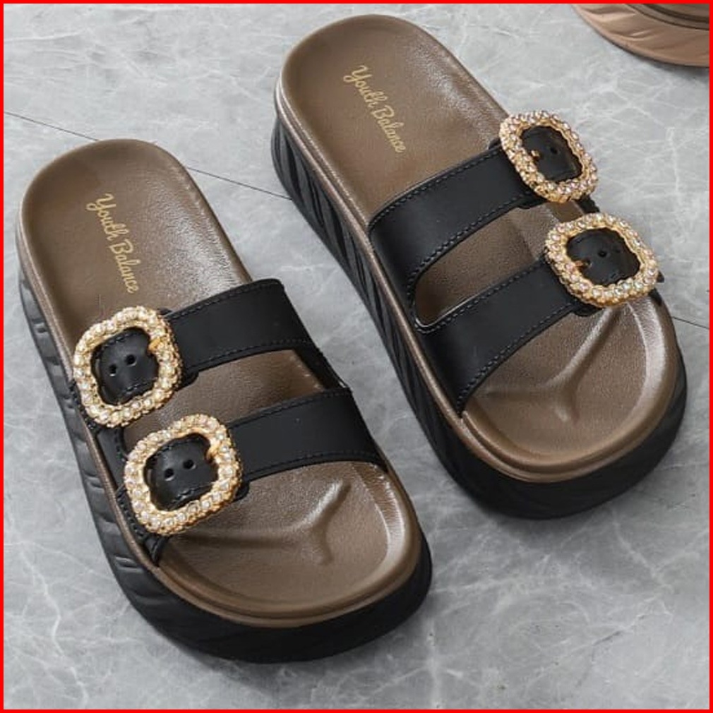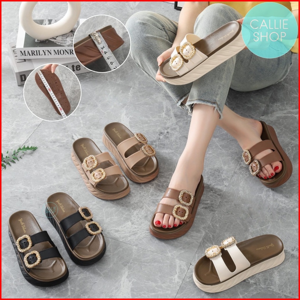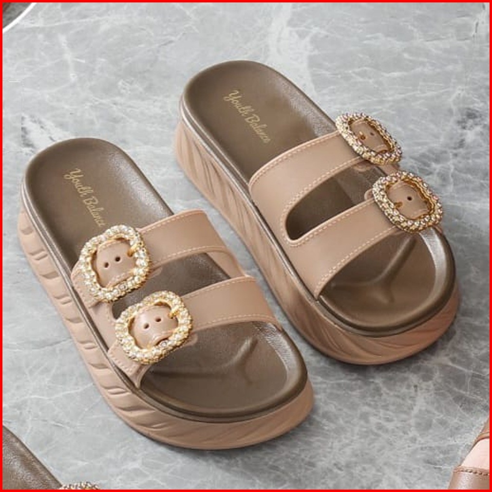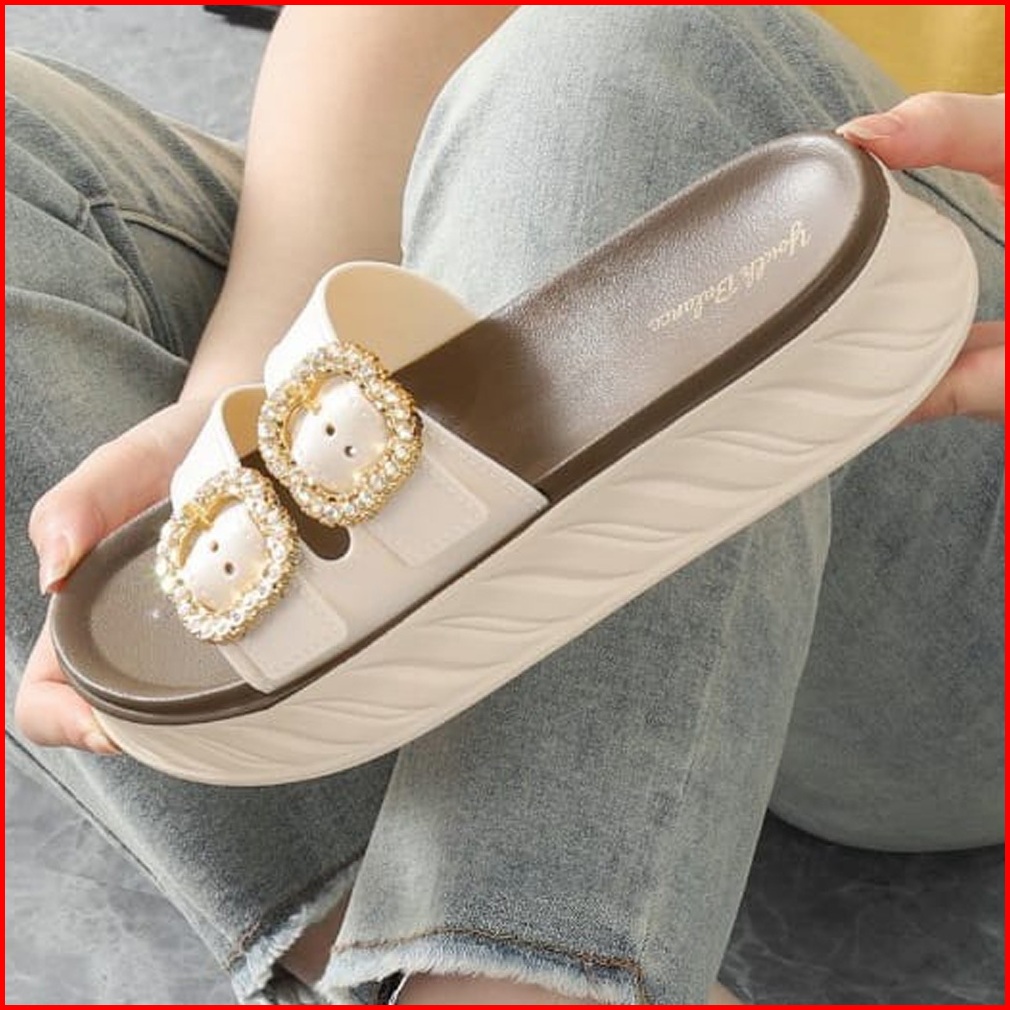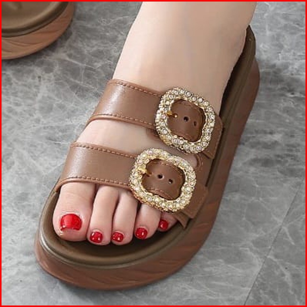 Sandal Platform Tali 2 Gesper Motif Permata Cantik Sol Tebal 3347-a1 Ban2gspmt