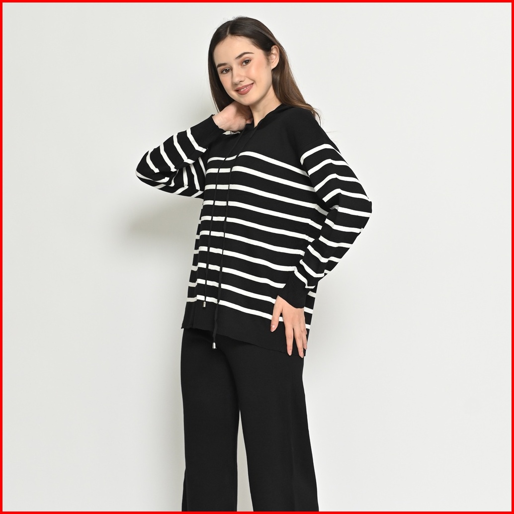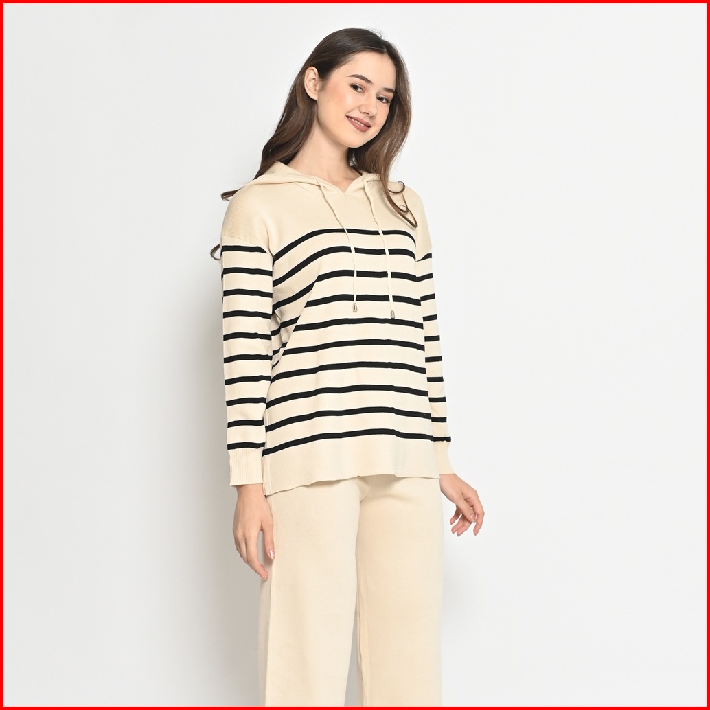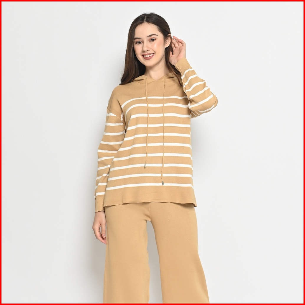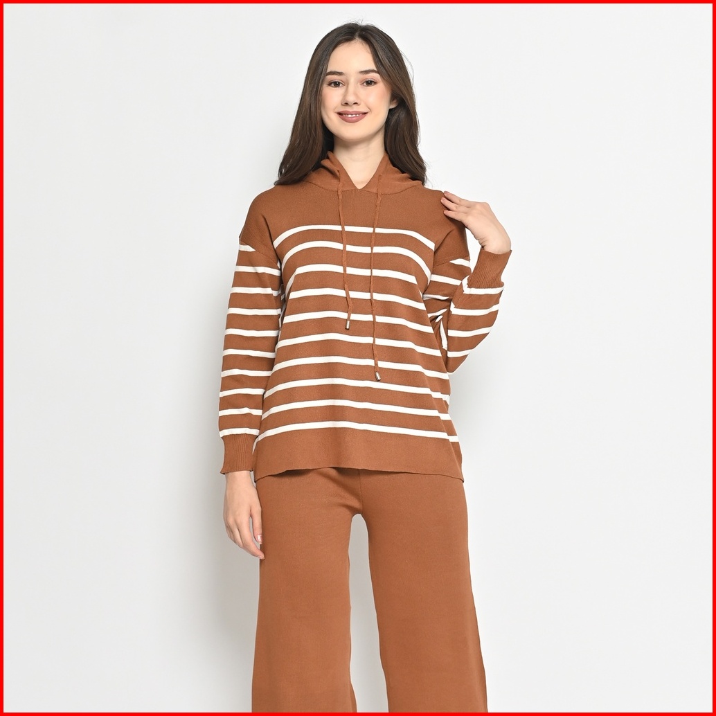 Queentin Sweater Hoodie Set Wanita 22193 Rajut Knit Striped Stretch Premium Lengan Panjang