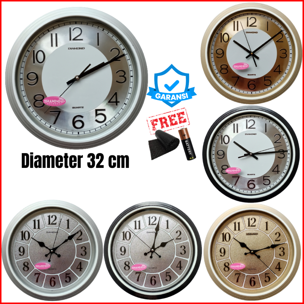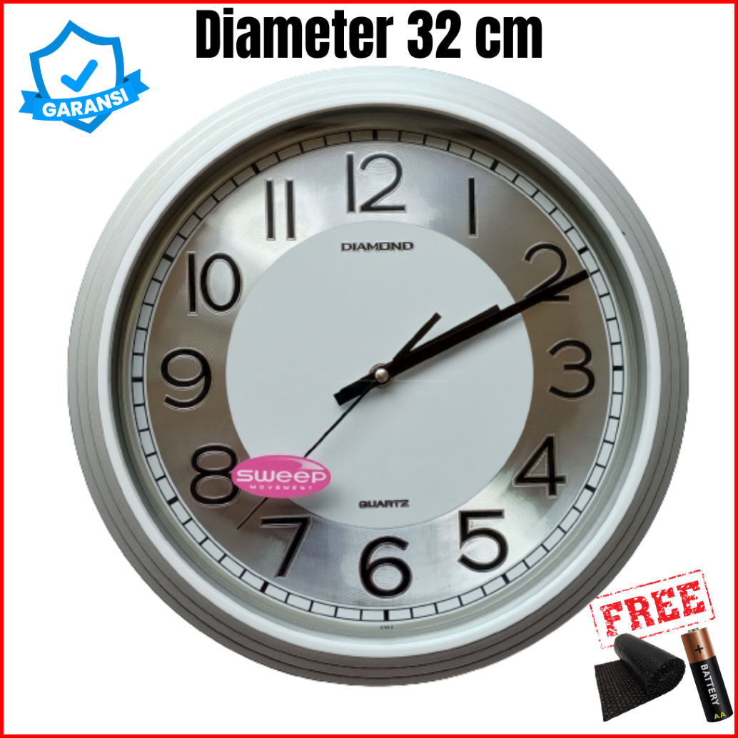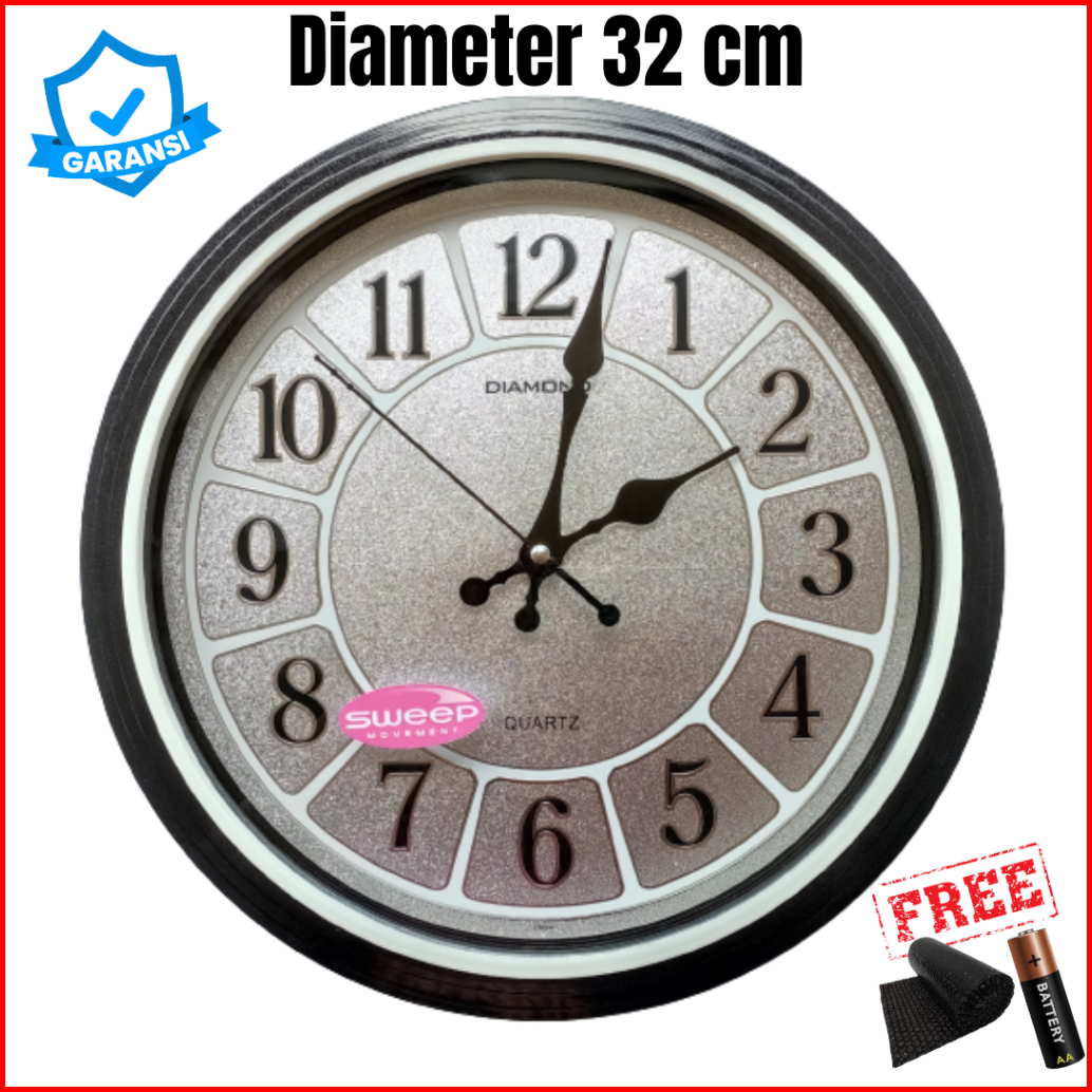 Jam Dinding Diamond 321 Series Diameter Jumbo 32cm Mesin Sweep Silent Tanpa Detak Black Silver