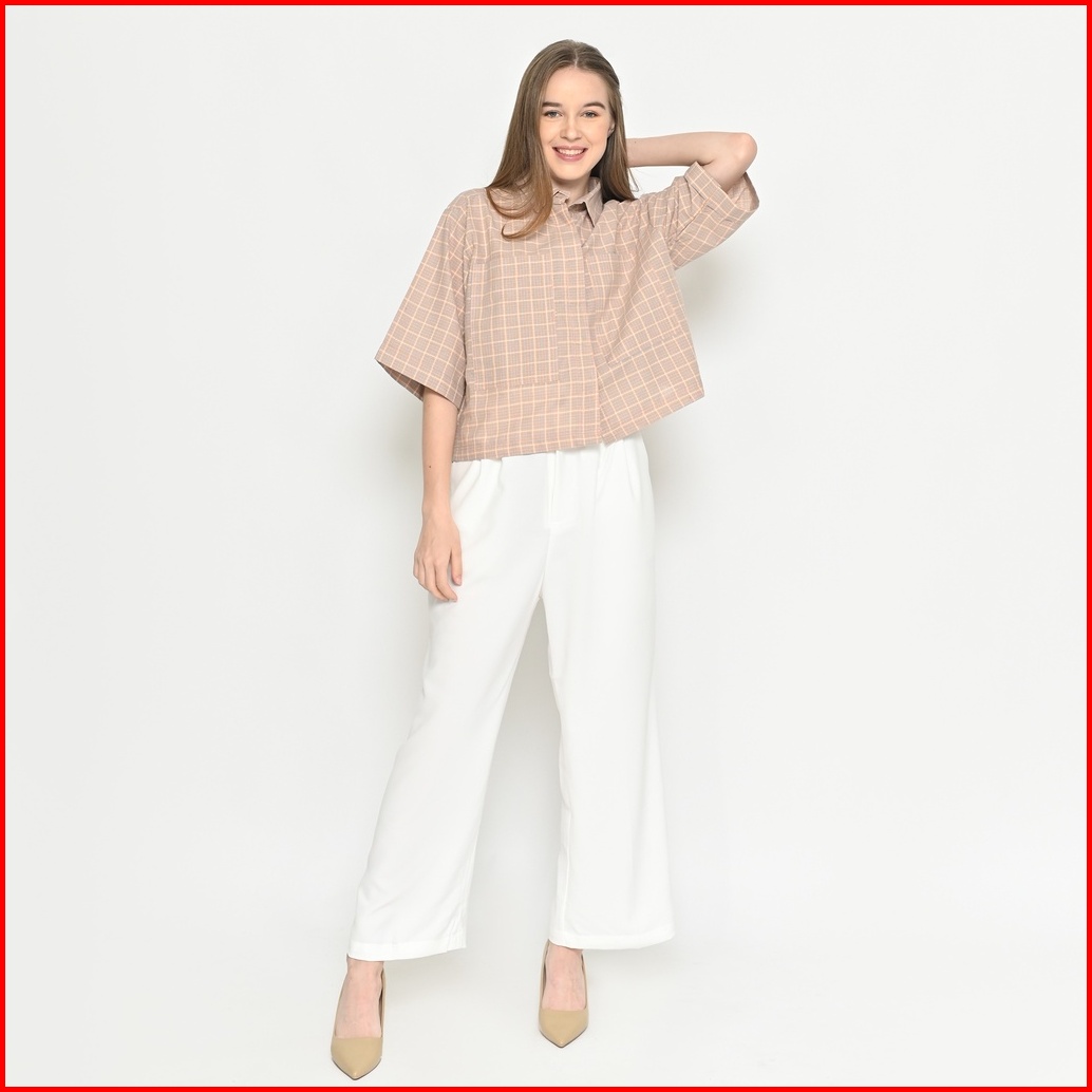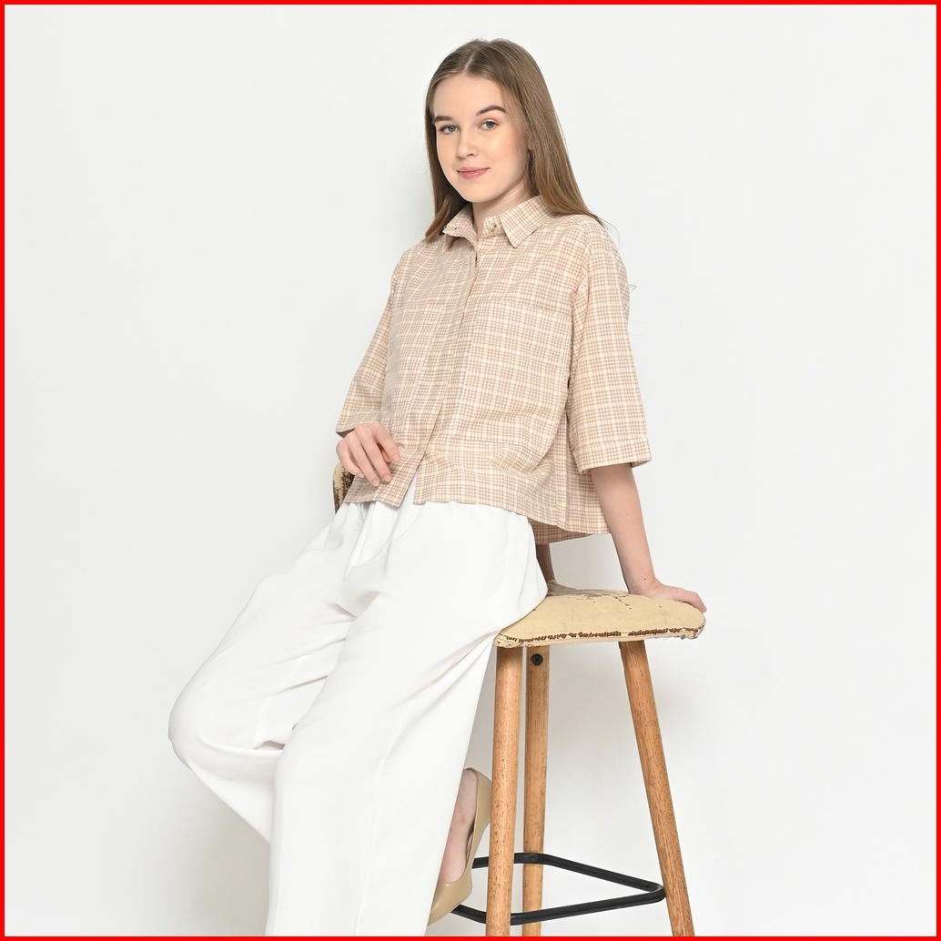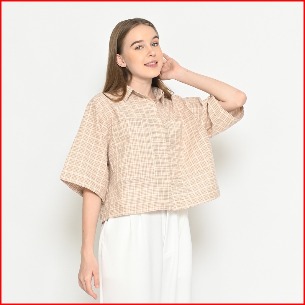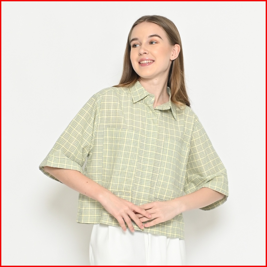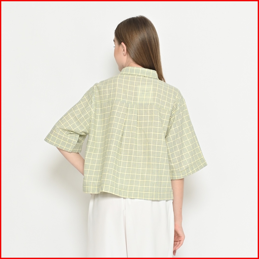 Queentin Kemeja Blouse Crop Wanita 0530 Katun Motif Kotak Dupplin Lengan Siku