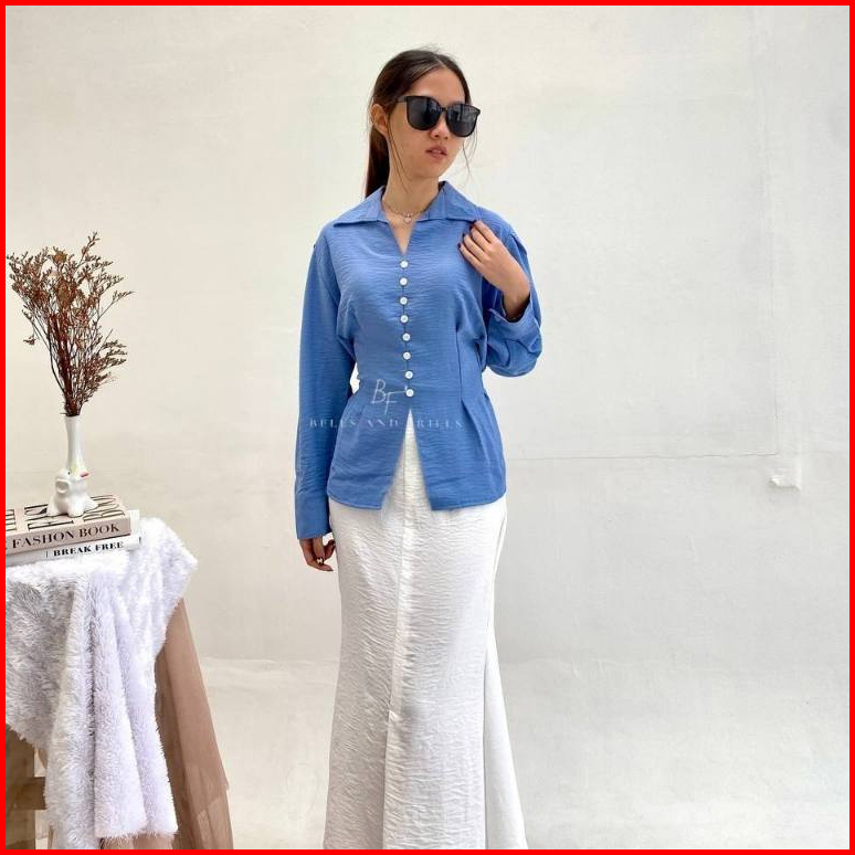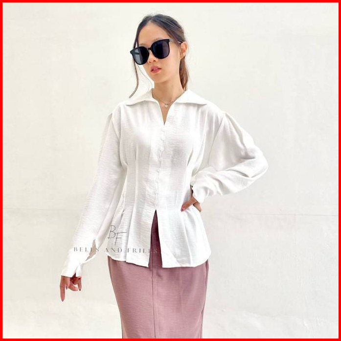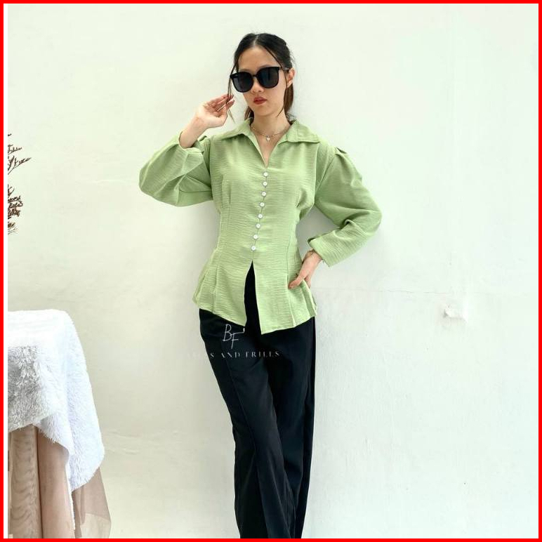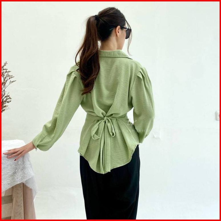 Zia Blouse Crinkle Atasan Long Sleeve V Neck Crincle Airflow Atasan Wanita Kemeja Korean Lengan Puff Panjang 0464