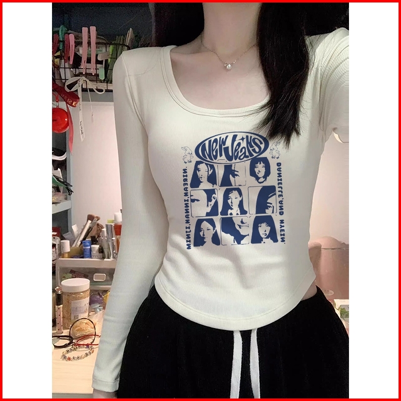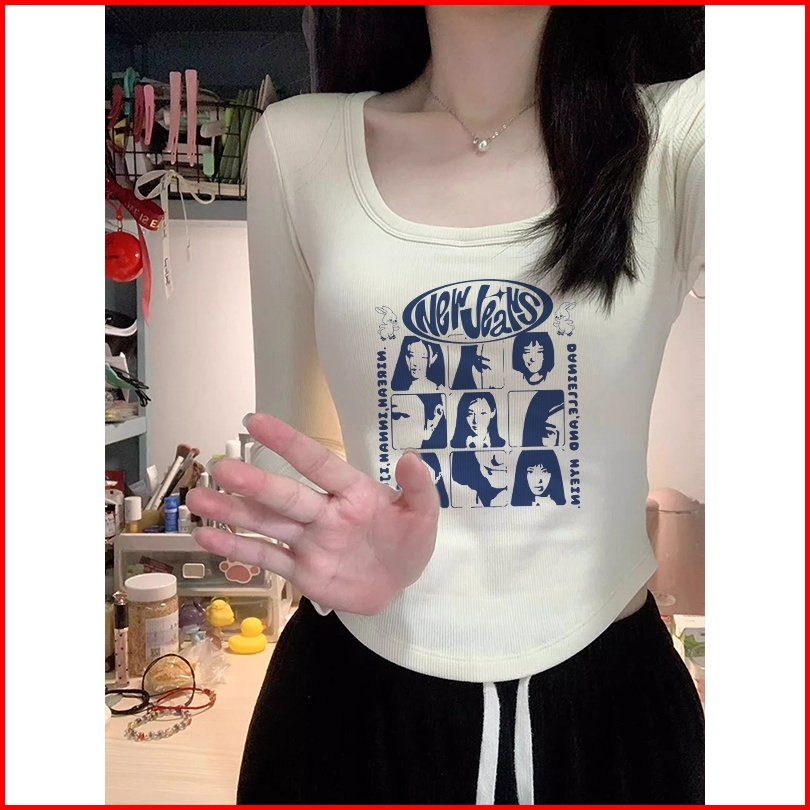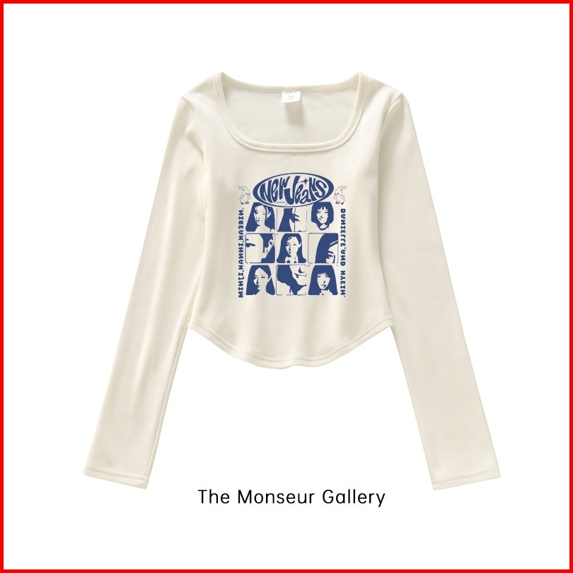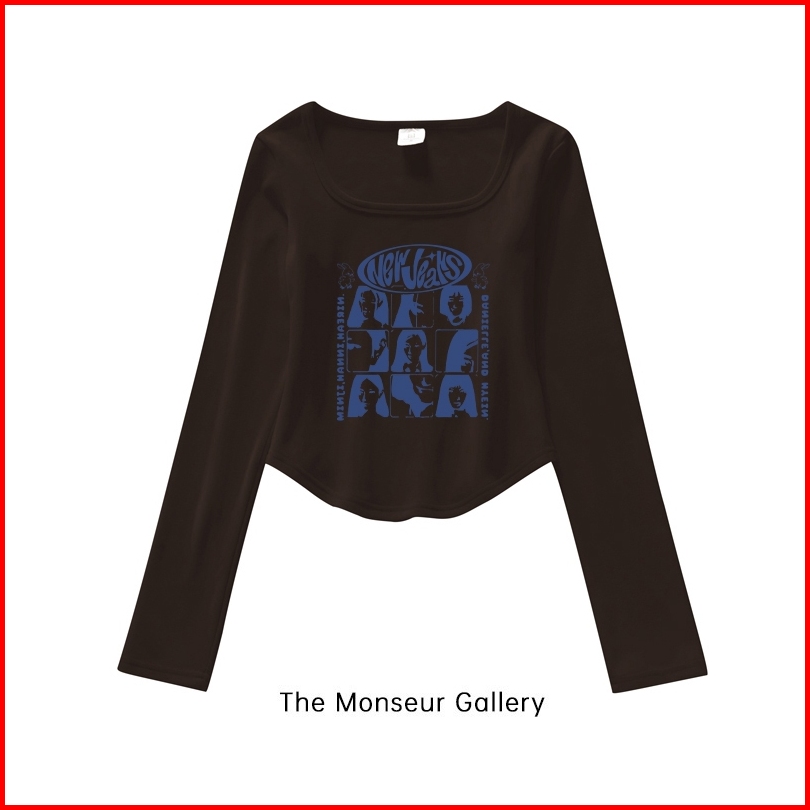 The Monseur Gallery Kaos Wanita Leher Persegi Gaya Korea Fashionista Grafis Atasan Lengan Panjang Ramping Atasan Wanita