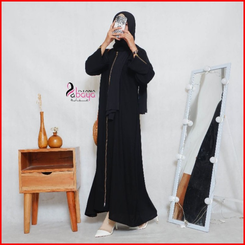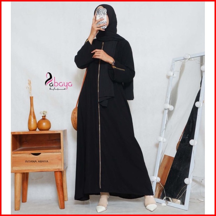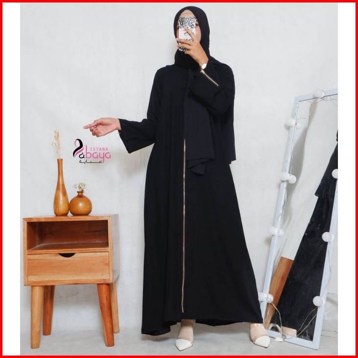 Abaya Polos Ziper Full Dipadu Kain Hitam Pekat Simpel Minimalis Cantik Bgt