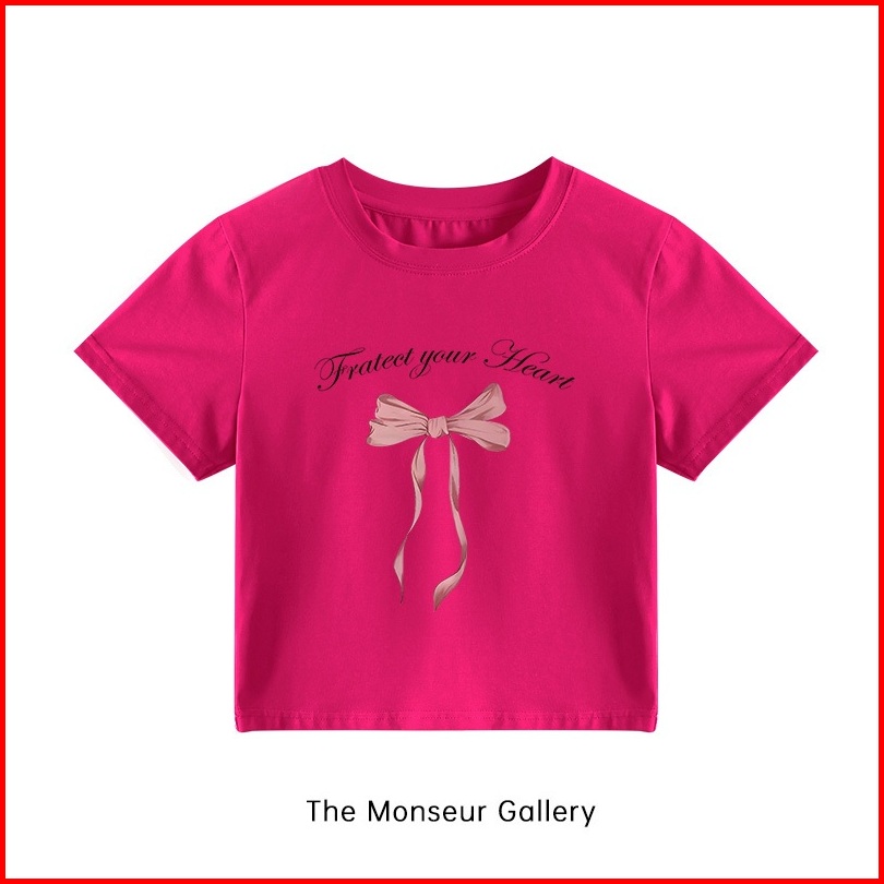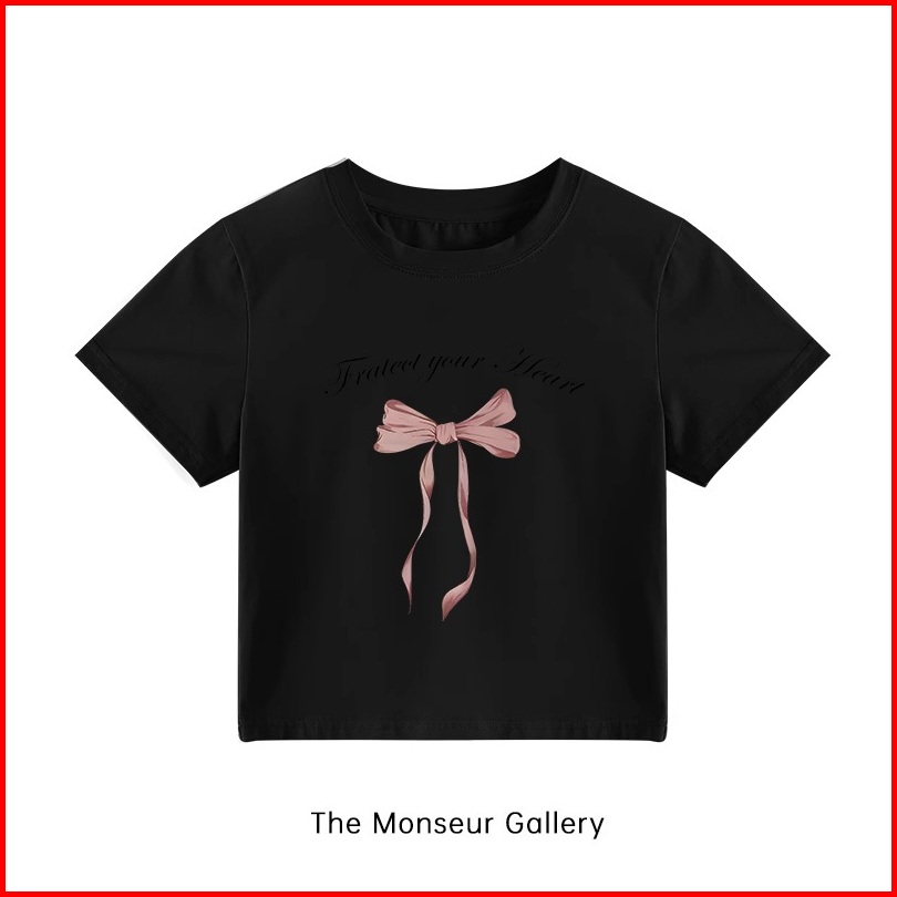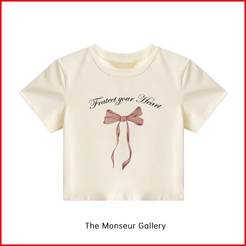 The Monseur Gallery Kaos Crop Wanita Slimfit Pink Bow Baju Croptee Cream Korea