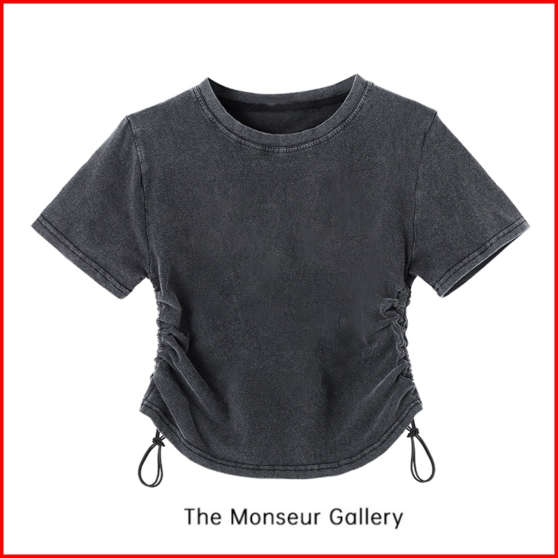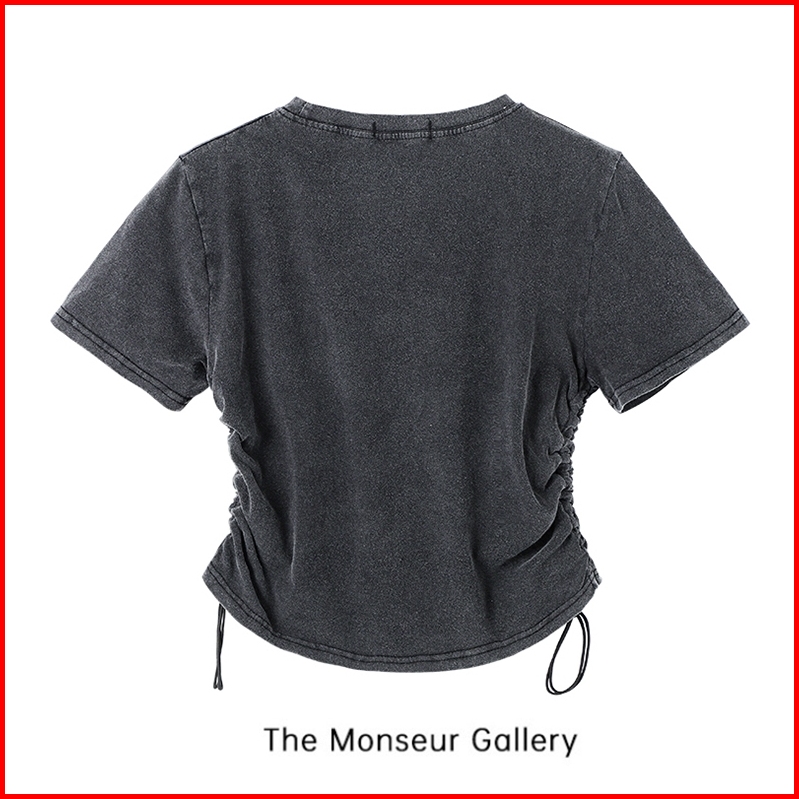 The Monseur Gallery Kaos Cop Korean Style Retro Washed Hitam T-shirt Drawstring Wanita