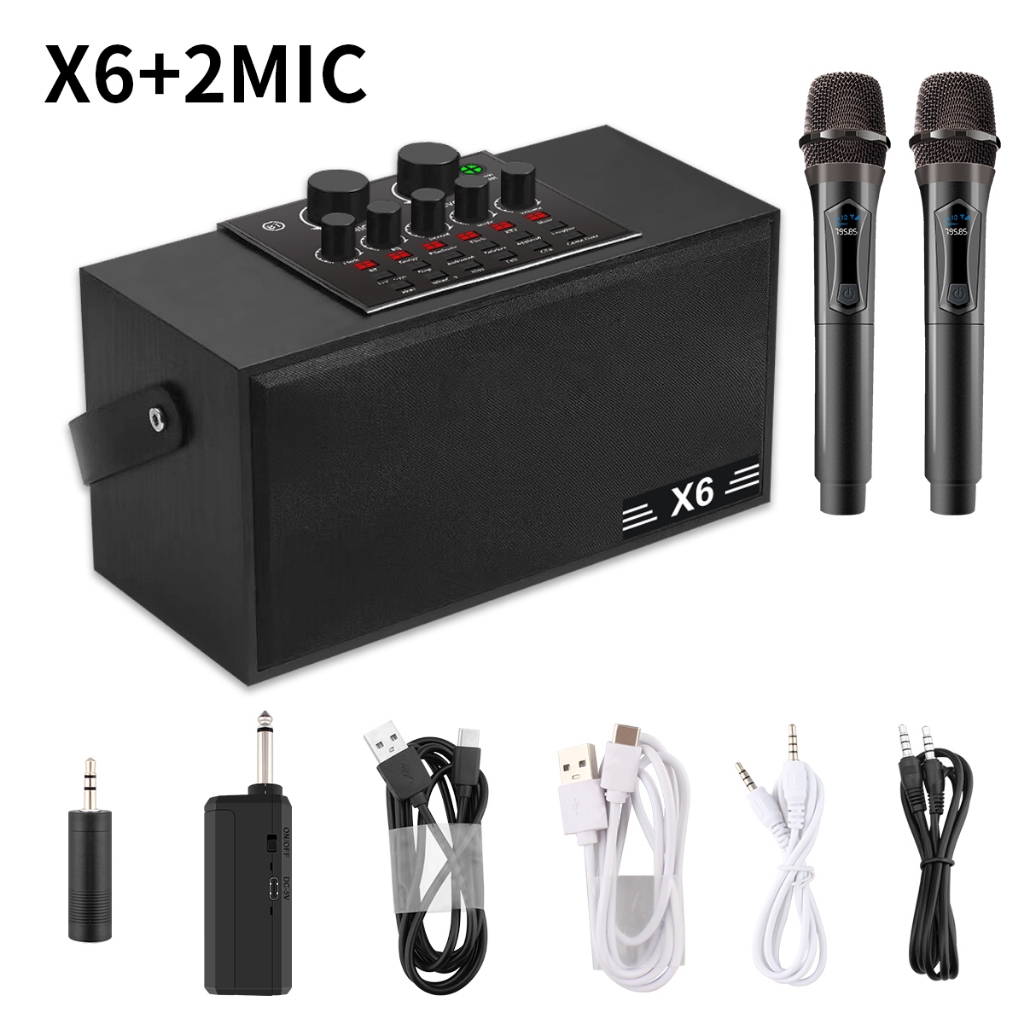 X6 Paket Karaoke Lengkap Soundcard Kartu Suara Audio with W306 wireless two microphone with external speaker Family