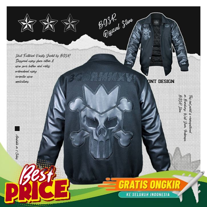 [Mall] Jaket Varsity Full Hitam Jacket Vintage Pria Windbreaker Bordir Tebal Adem