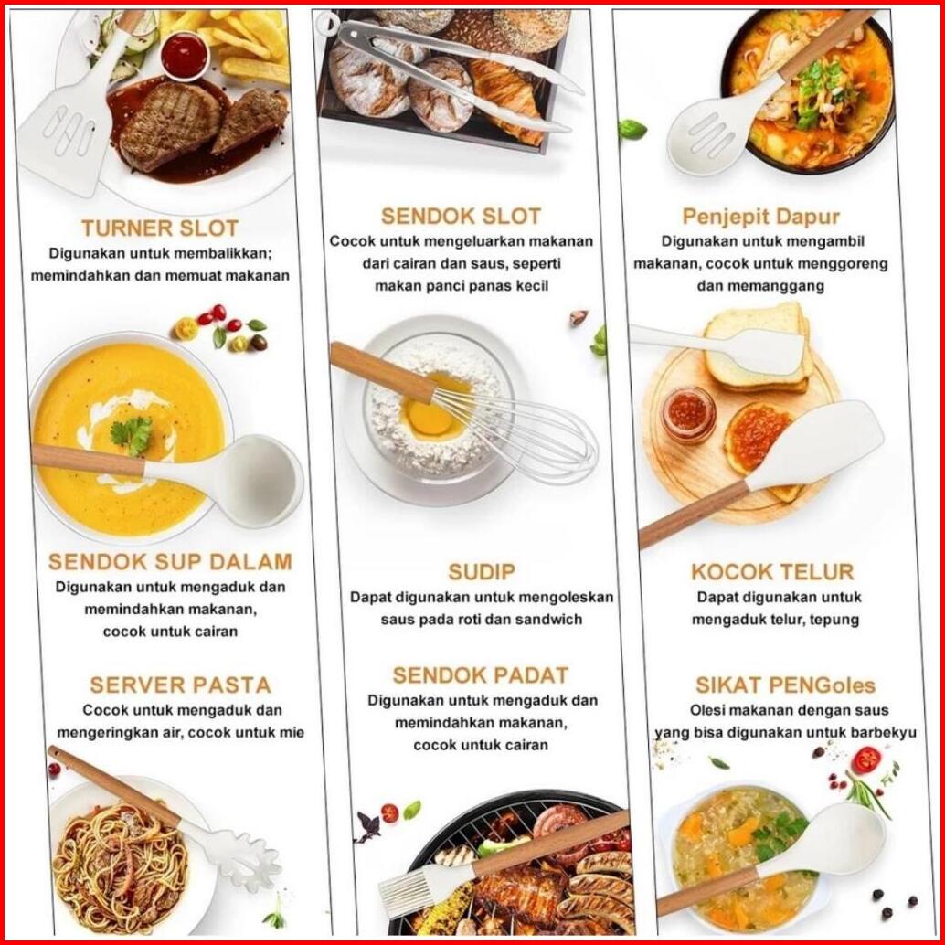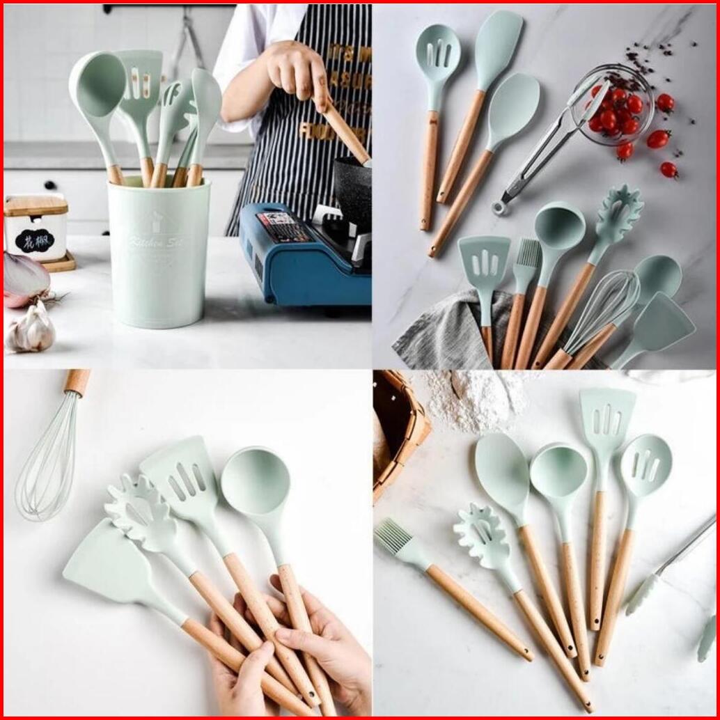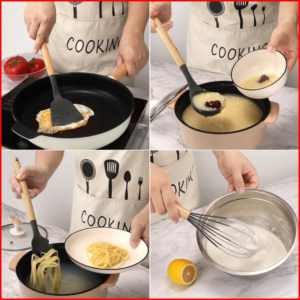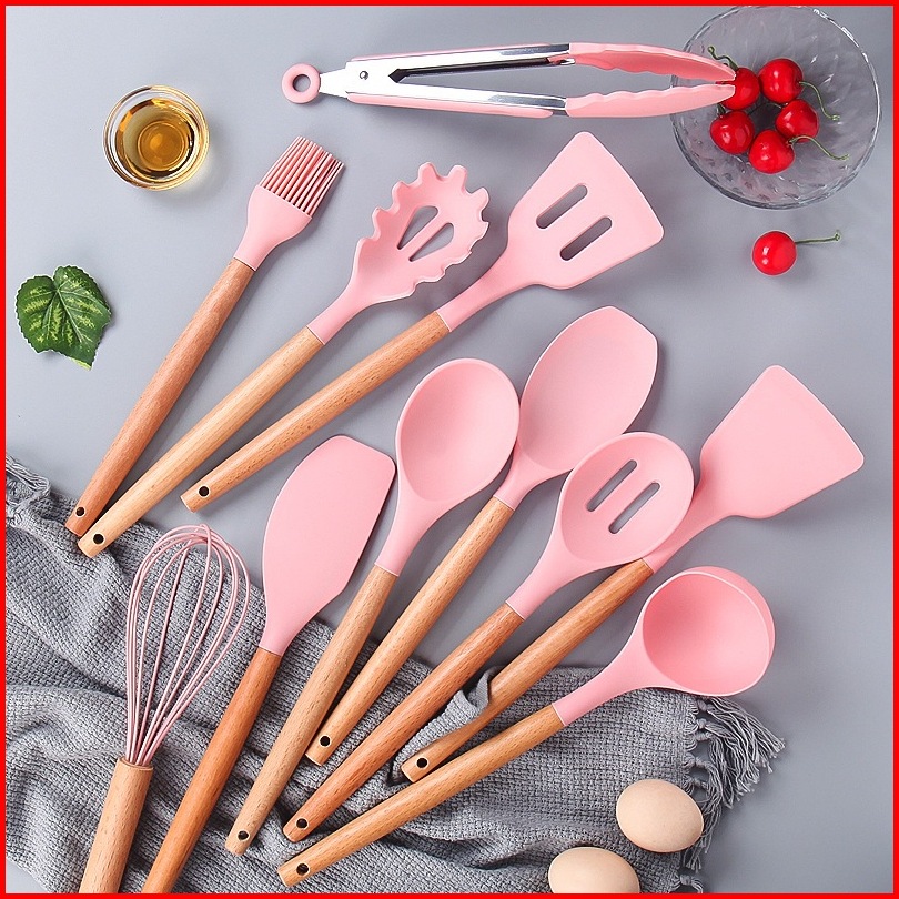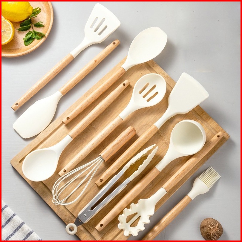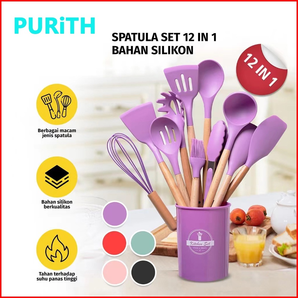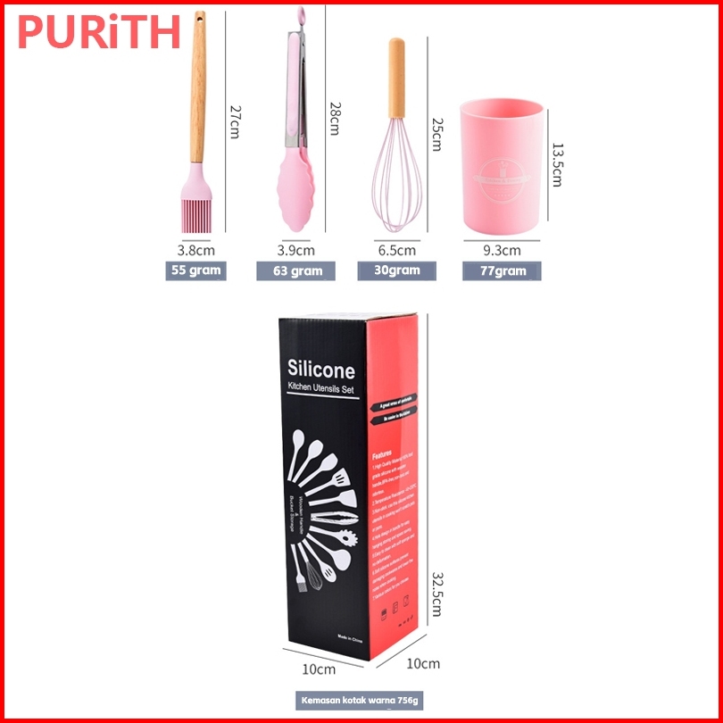 Purith Kualitas Yang Tahan Panas Silicone Alat Masak Set 12pcs Pegangan Kayu Spatula Steak Clip Silikon Spatula Oil Brus
