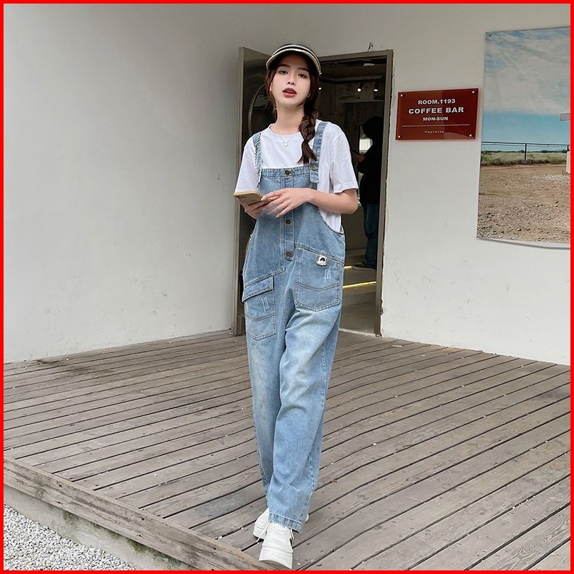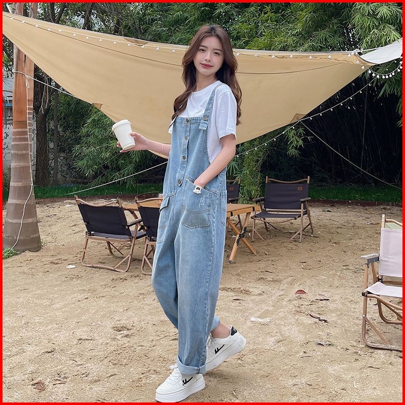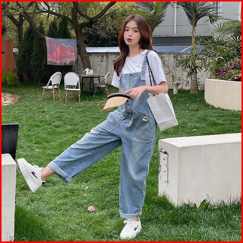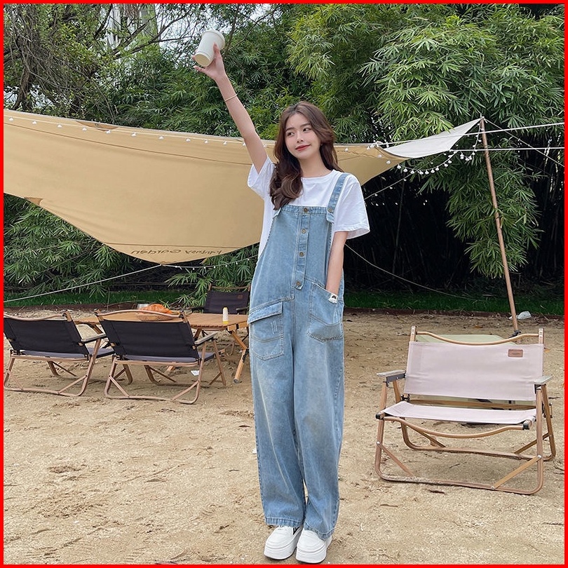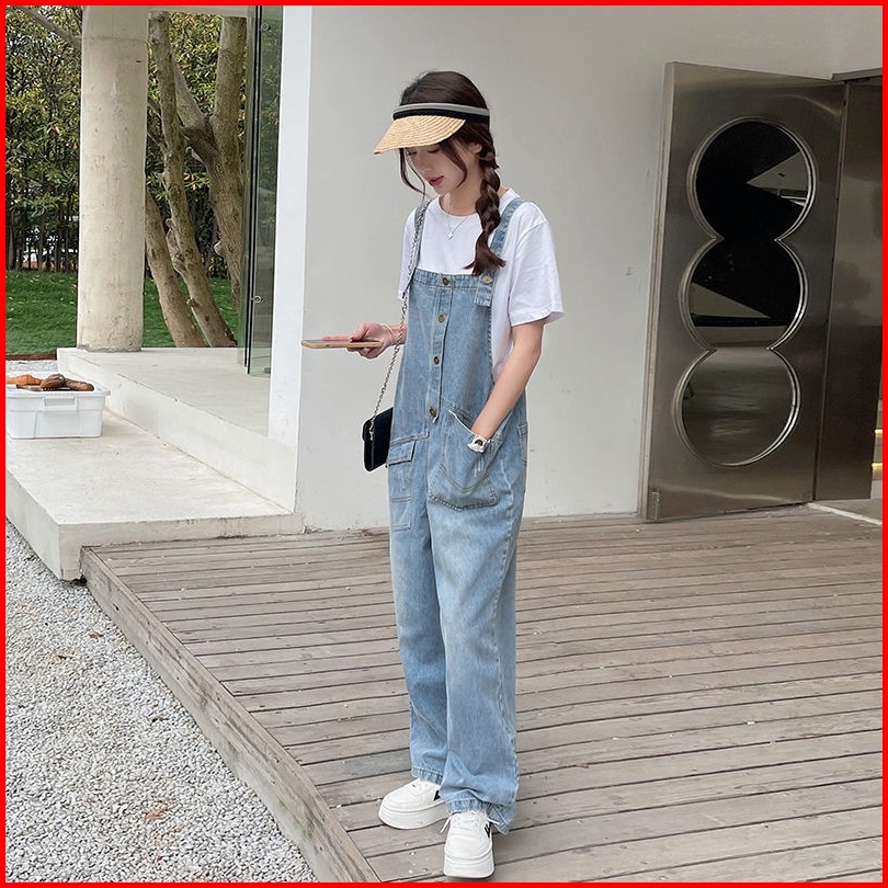Sari Single Set Overall Denim Warna Terang Celana Lebar Kaki Lurus Longgar Gaya Korea Baru 018