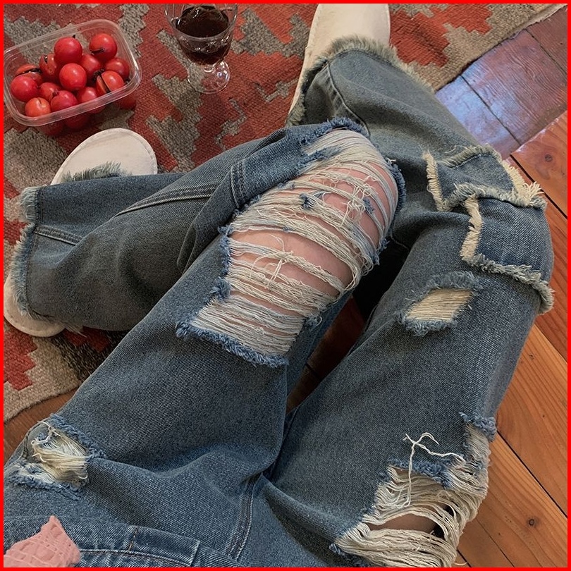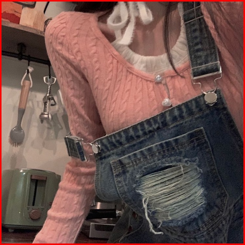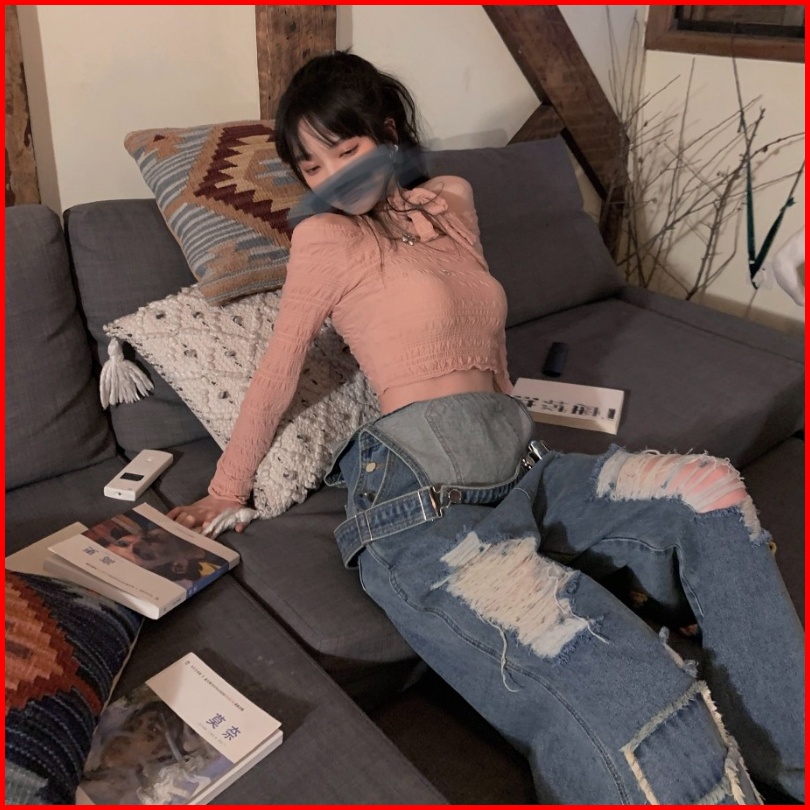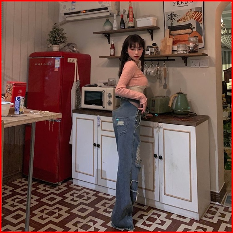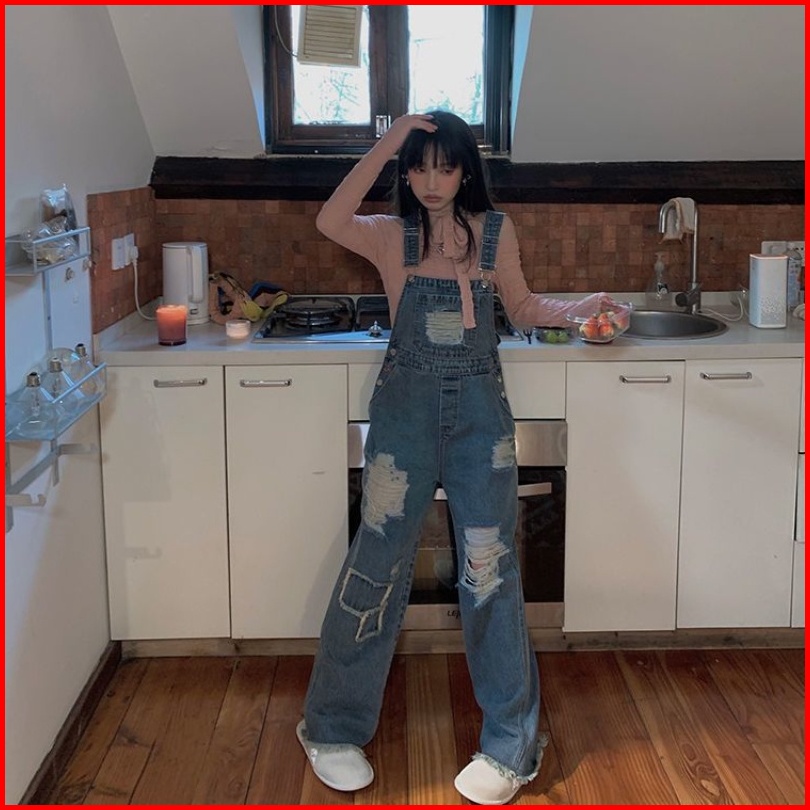 Xj0077 Retro Overall Denim Robek Wanita Pinggang Tinggi Retro Mengepel Celana Lebar Kaki