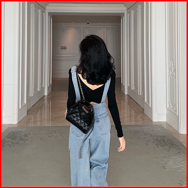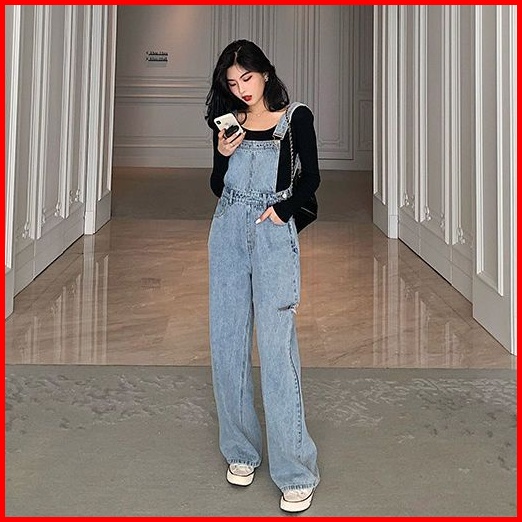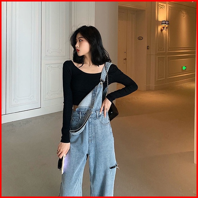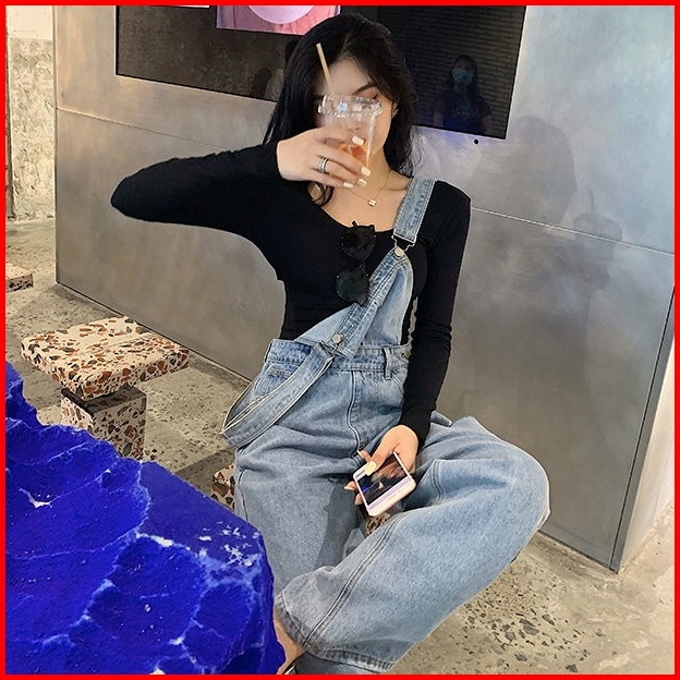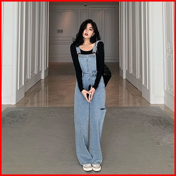 Overall Denim Wanita Model Jumpsuit Kaki Lebar Lurus Longgar Gaya Korea