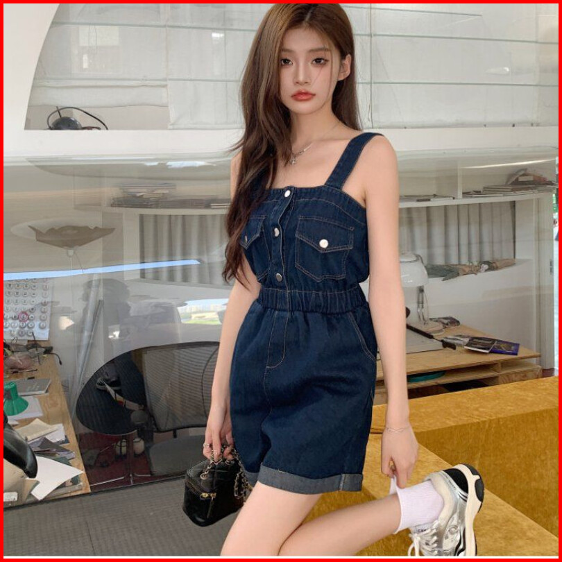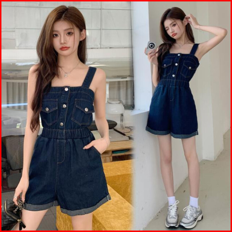Xj0109 Celana Pendek Jumpsuit Kaki Lebar Suspender Denim Pengikat Pinggang Wanita
