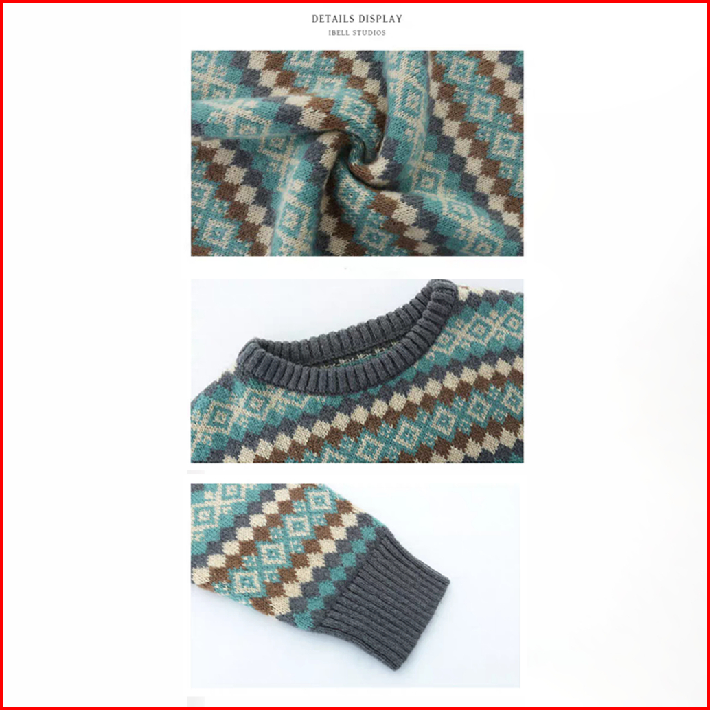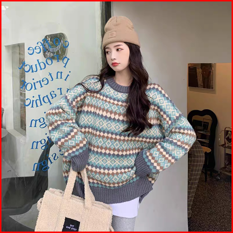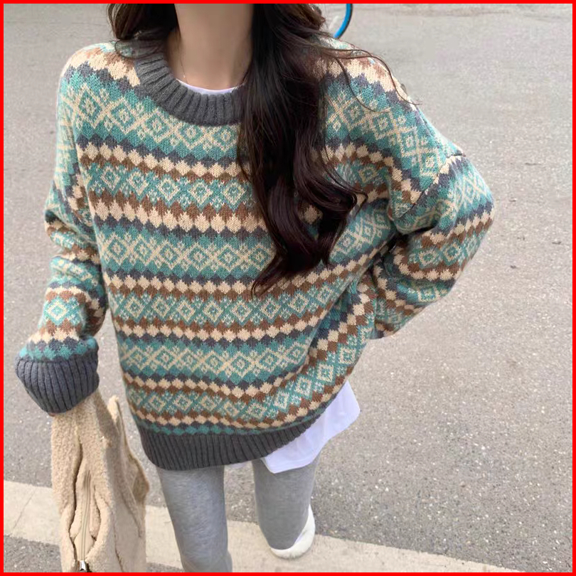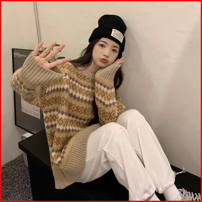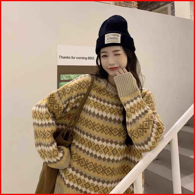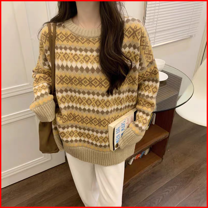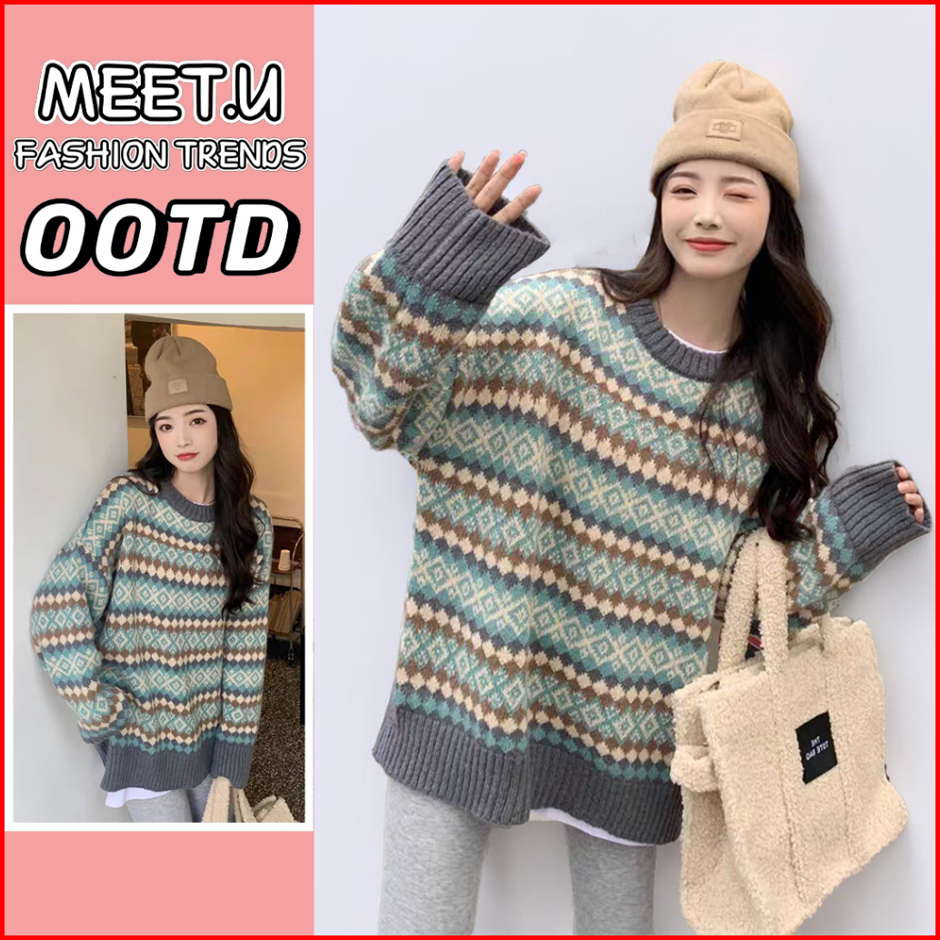 Meet.u Sweater Rajut Argyle Longgar Retro Wanita Sweter Pulover Kasual