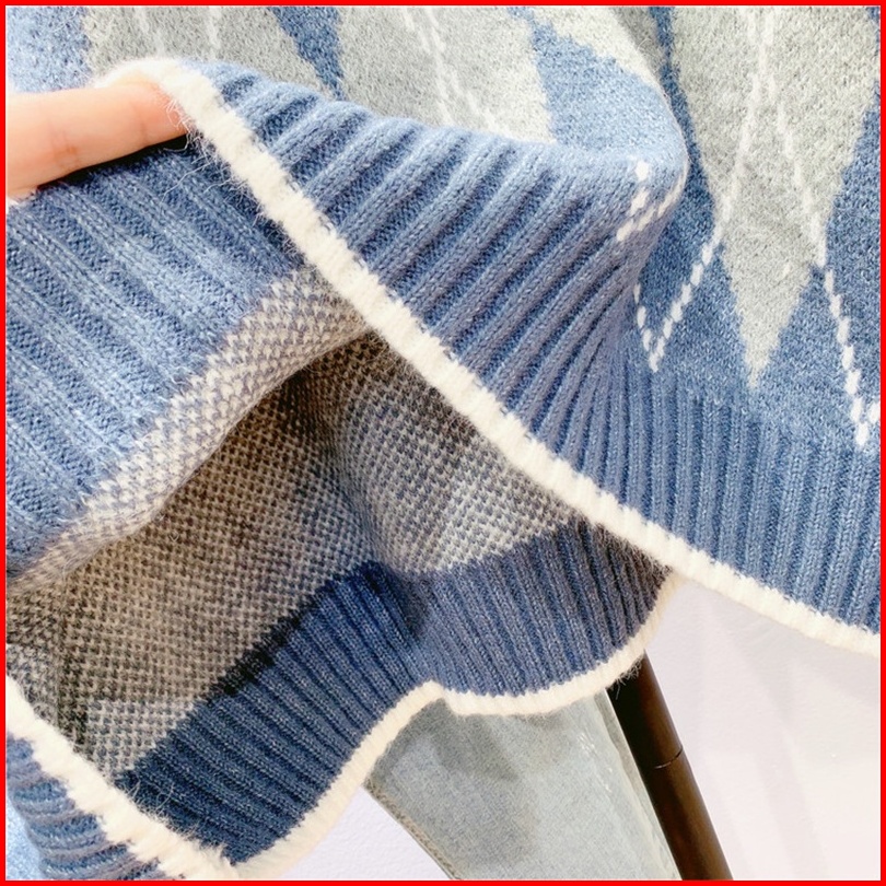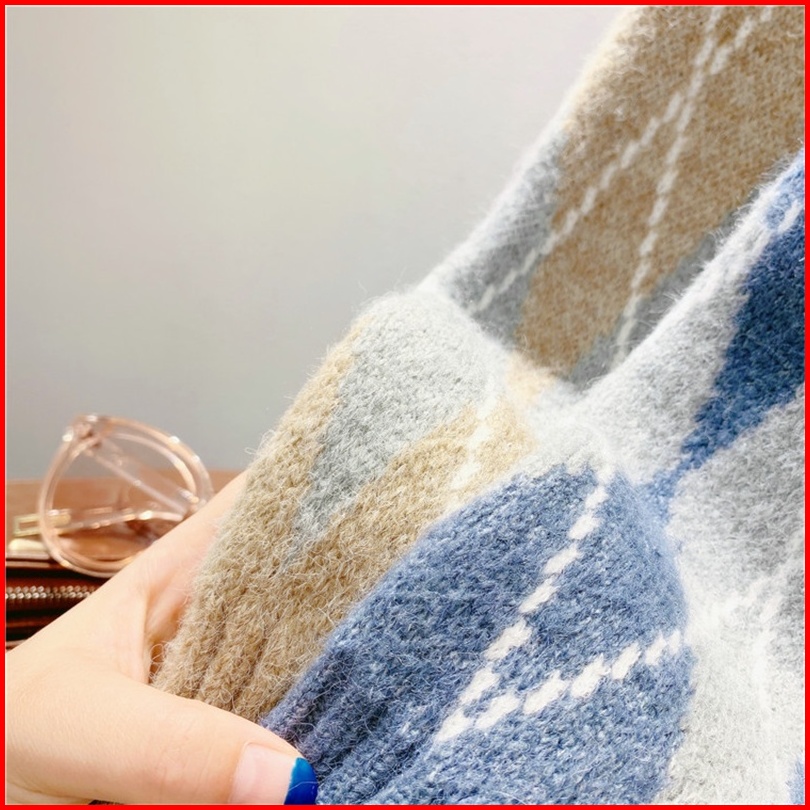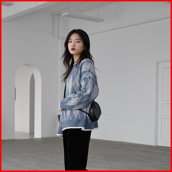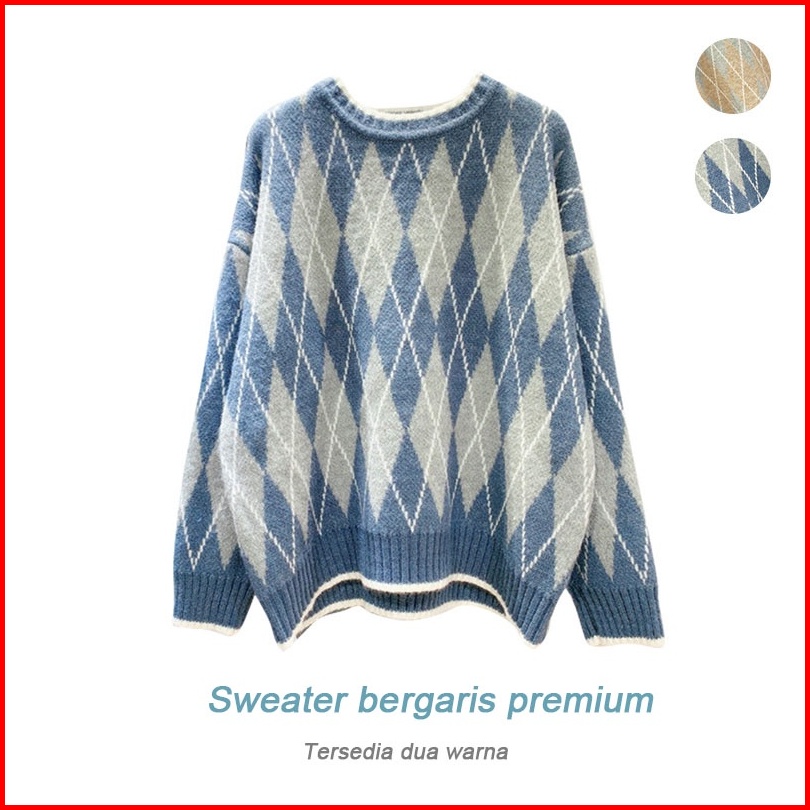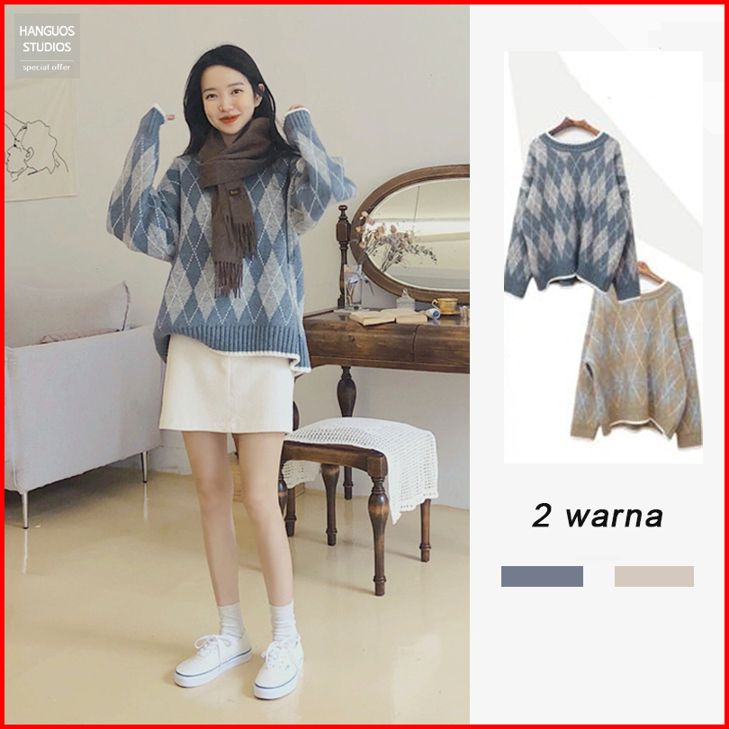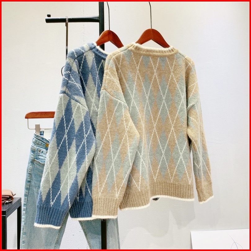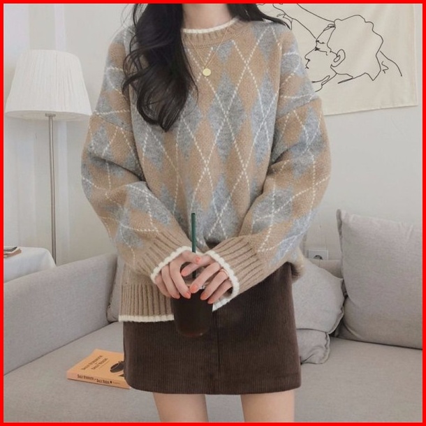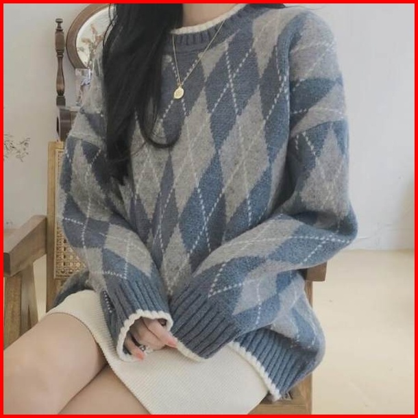 Sweater Pullover Vintage Crewneck Sweater Wanita Gaya Malas Atasan Kotak-kotak
