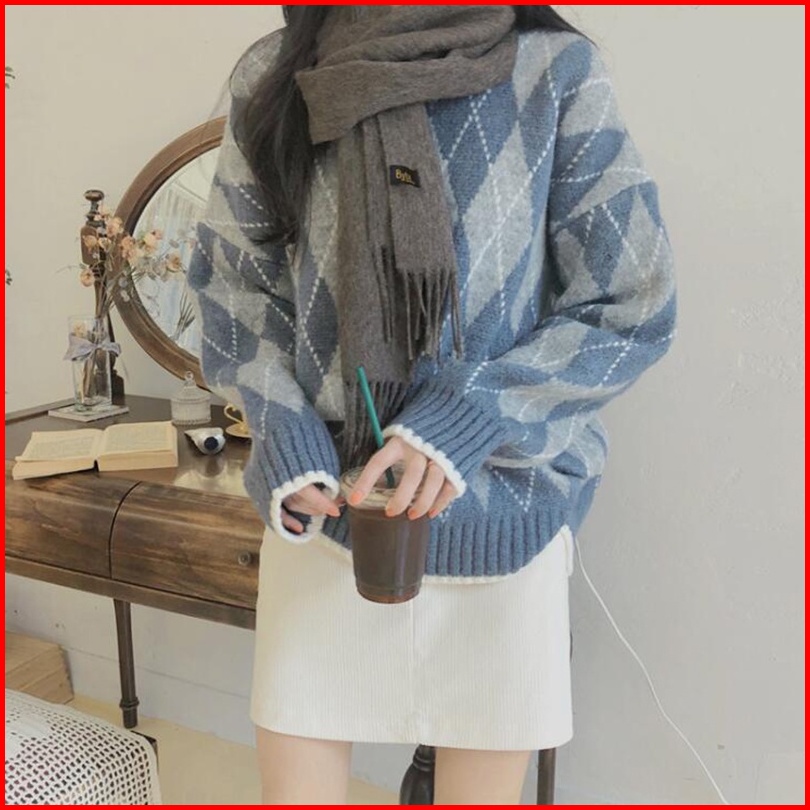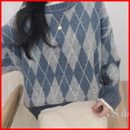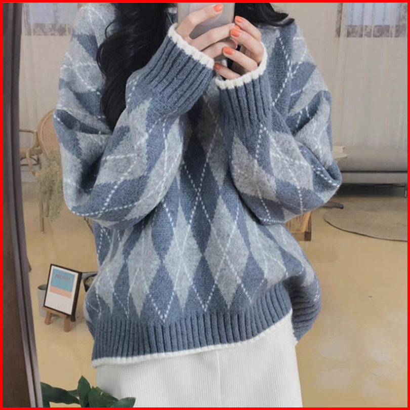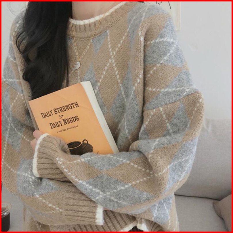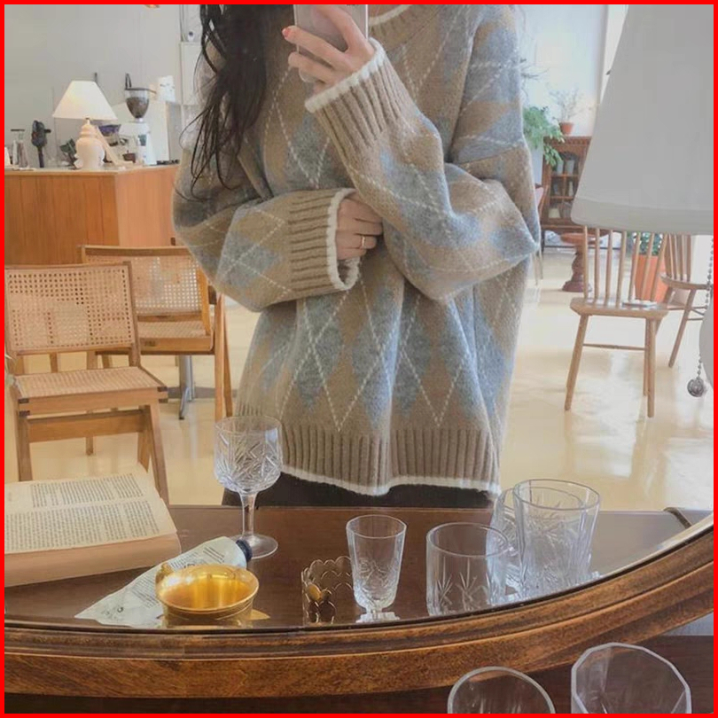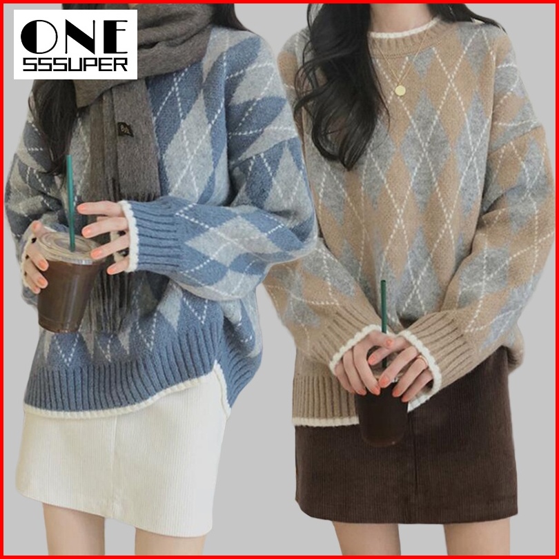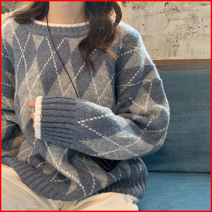 Sweater Rajut Wanita Crewneck Lengan Panjang Sweater Kisi Berlian Korea Retro Longgar Satu Ukuran Knitwear