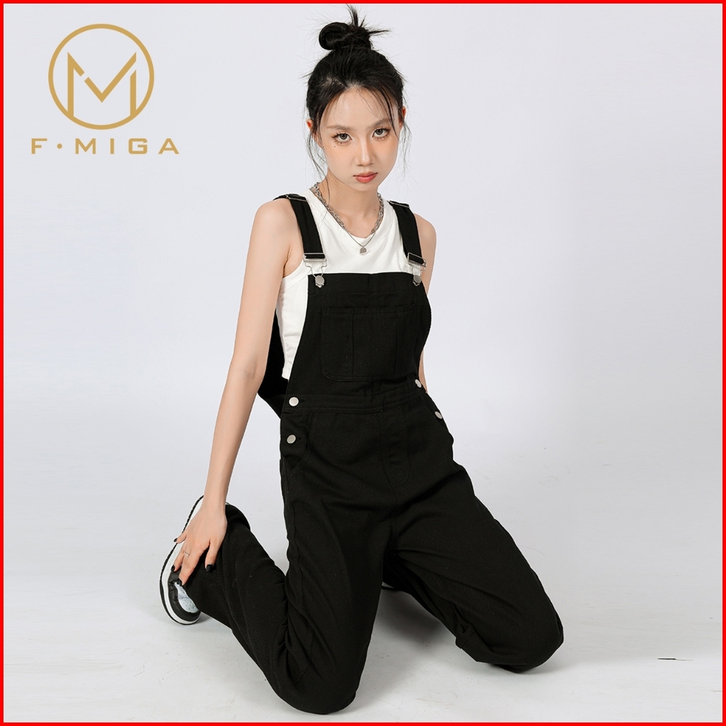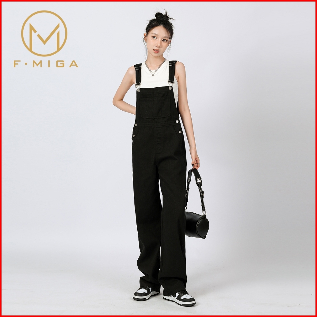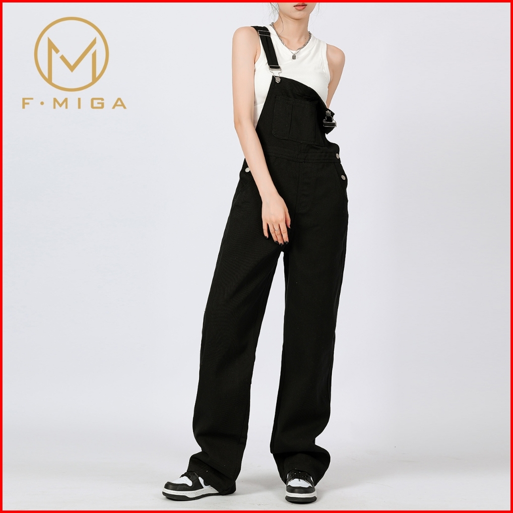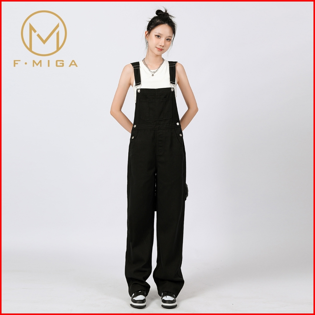 F Miga C51 Korean Style Cargo Wide Leg Playsuit Overall Jeans Wanita Kodok Panjang Celana Jeans Wanita - Hitam