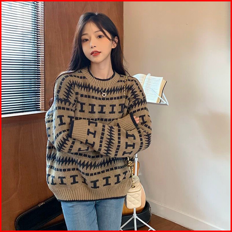 Yoyo Sweater Pullover Leher Bulat Jacquard Longgar Yang Chic Untuk Wanita