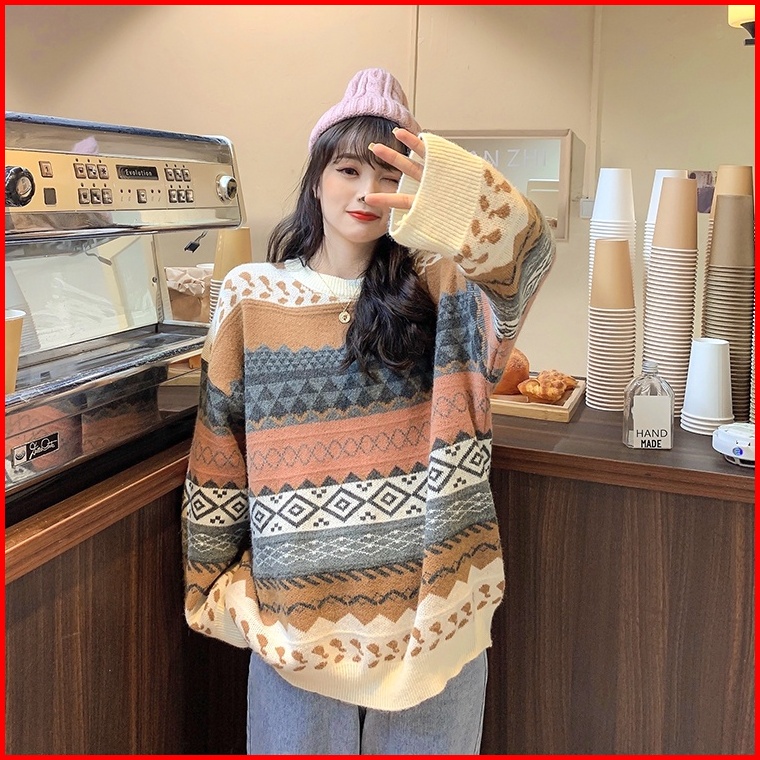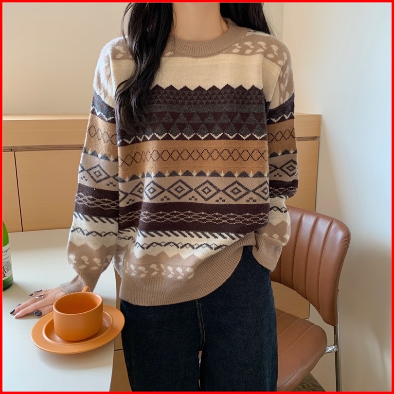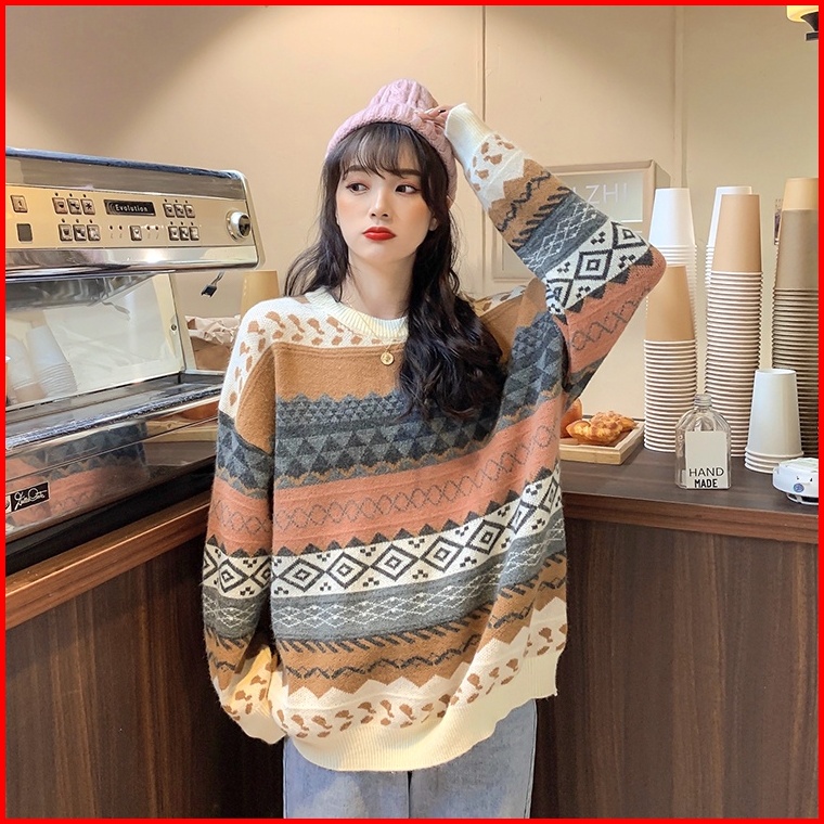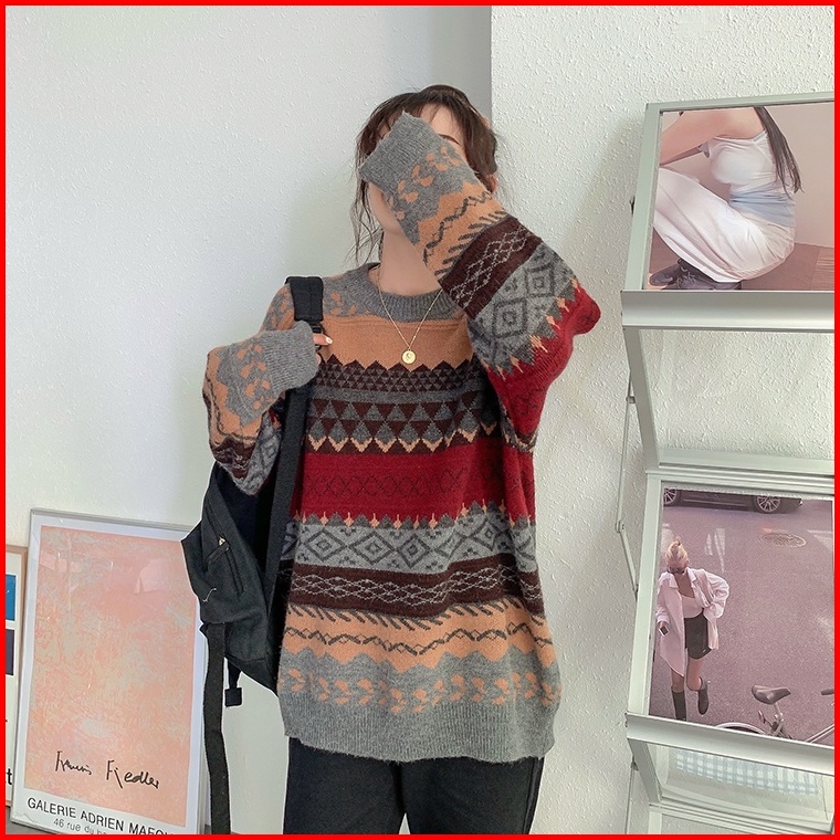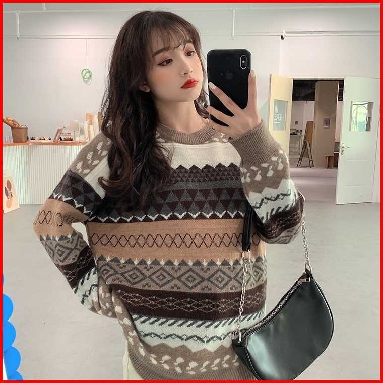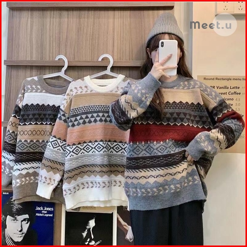 Meet.u Gaya Baru Sweater Rajut Kasual Tebal Loose Sweter Atasan Wanita Vintage