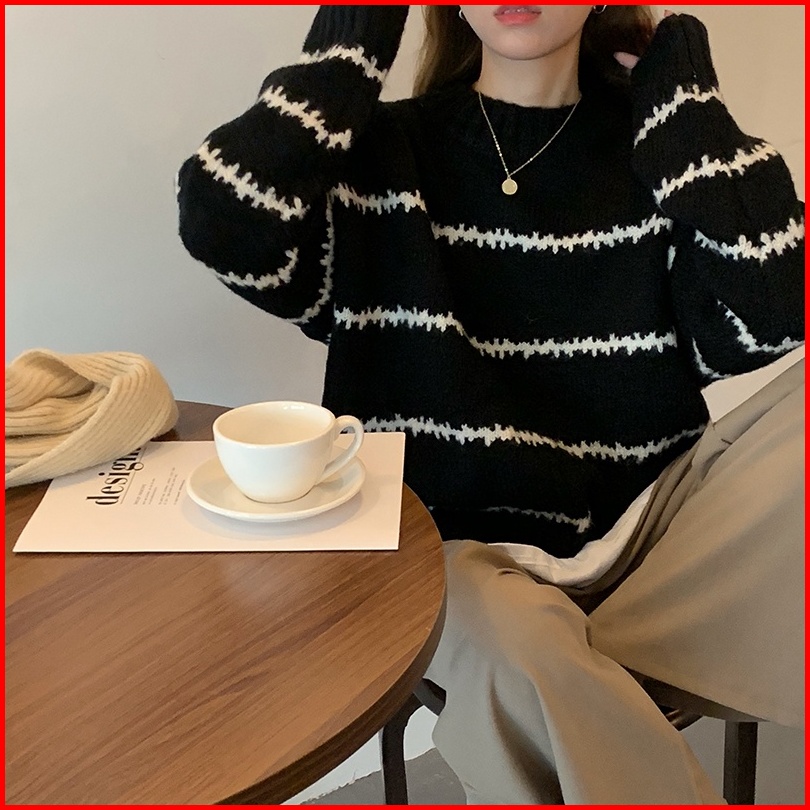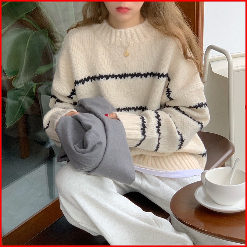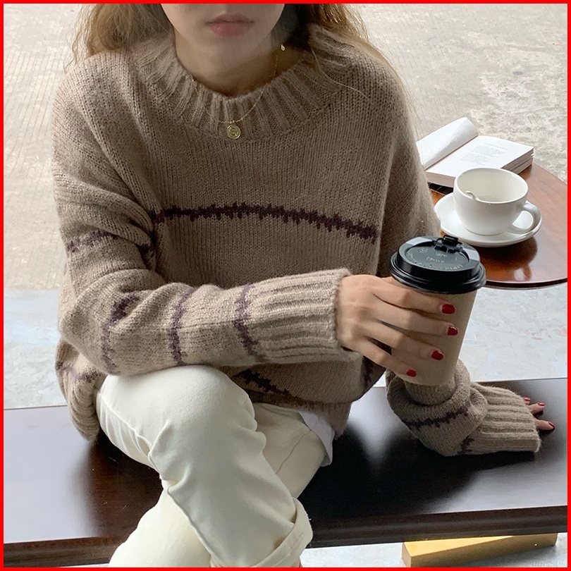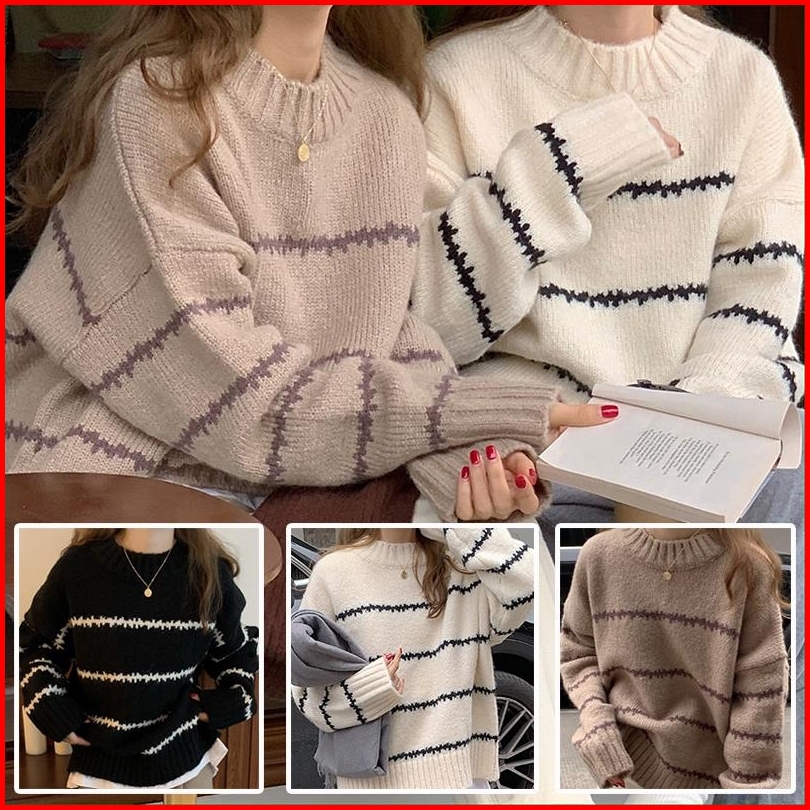 Sweater Pullover Leher Bulat Wanita Gaya Korea Baru Sweater Lengan Panjang Bergaris Longgar