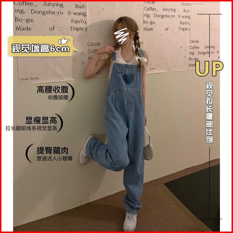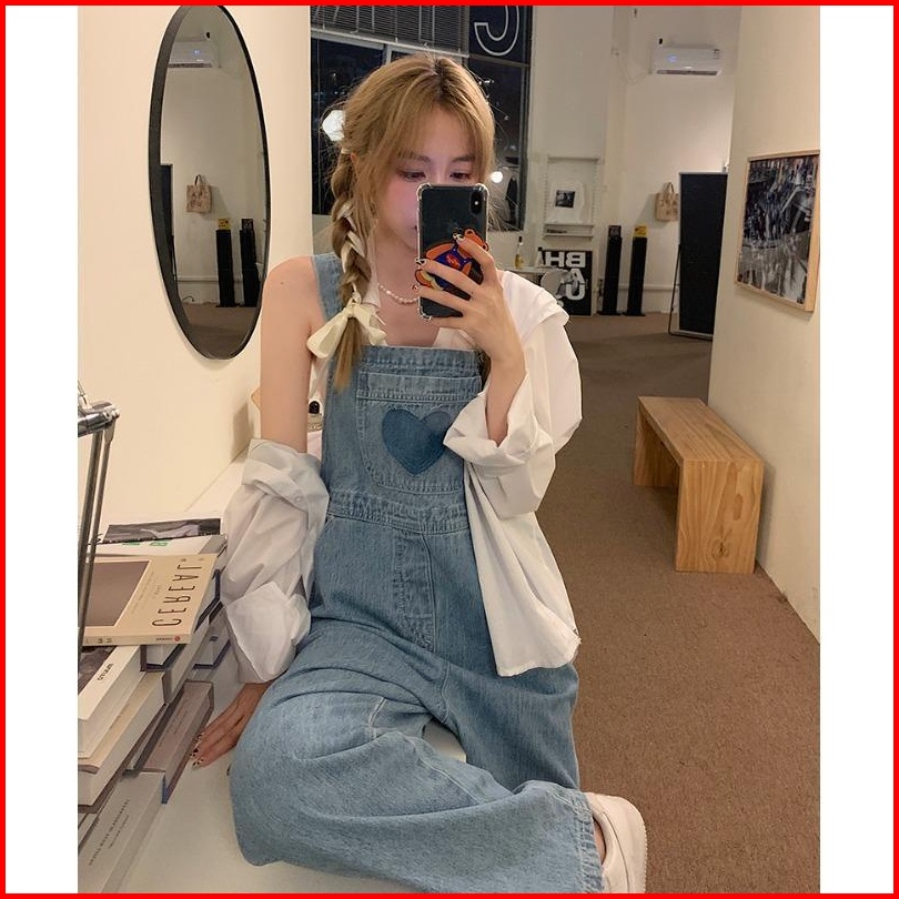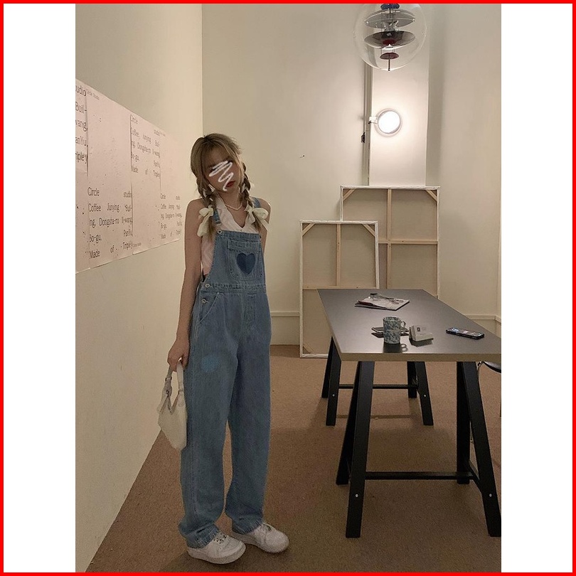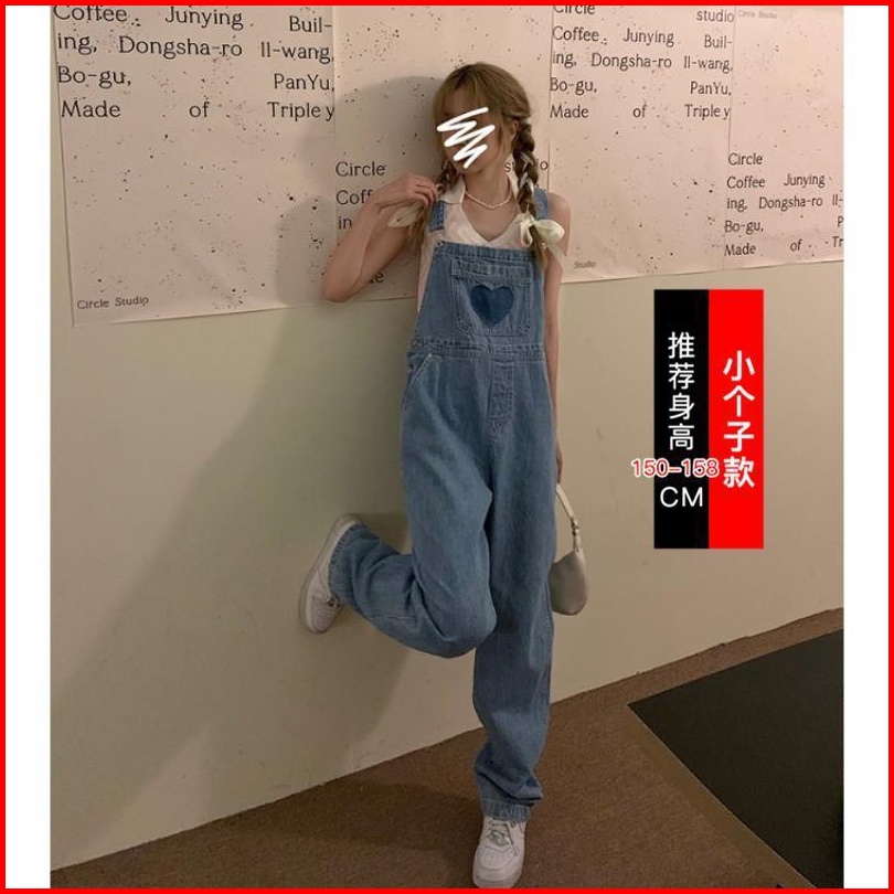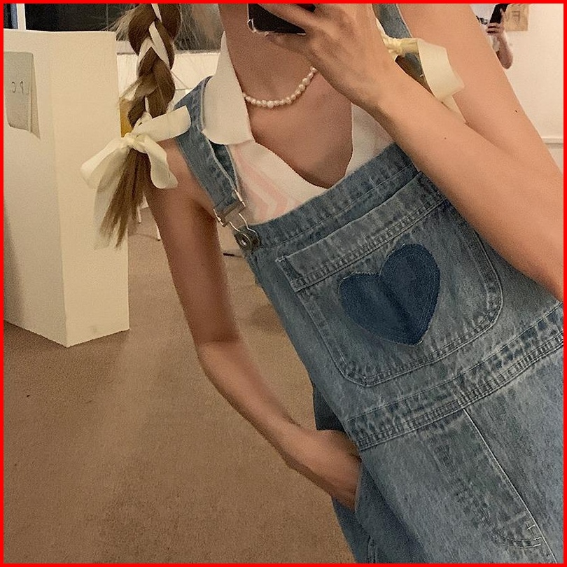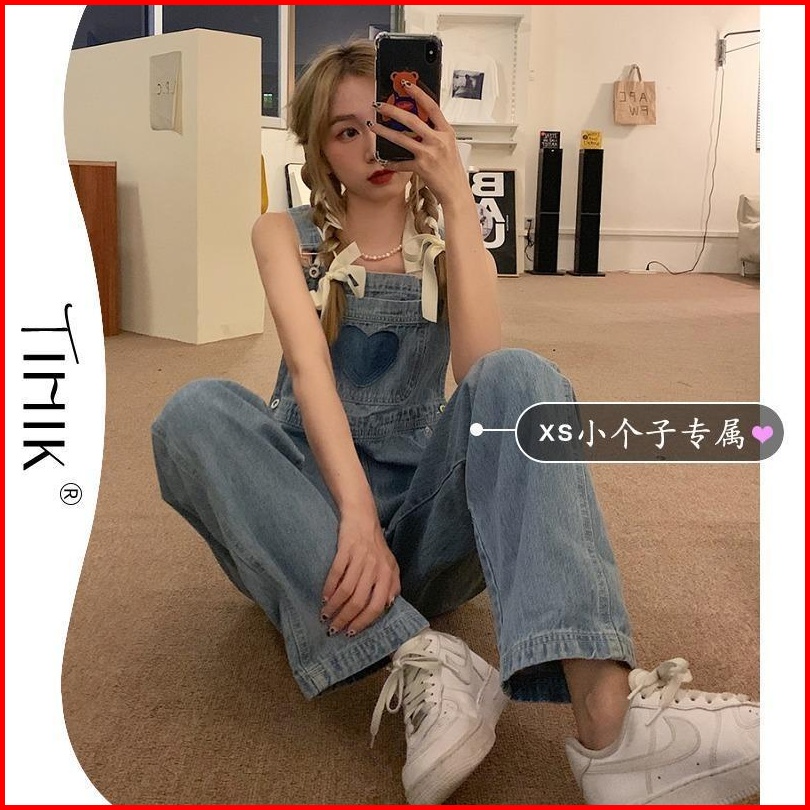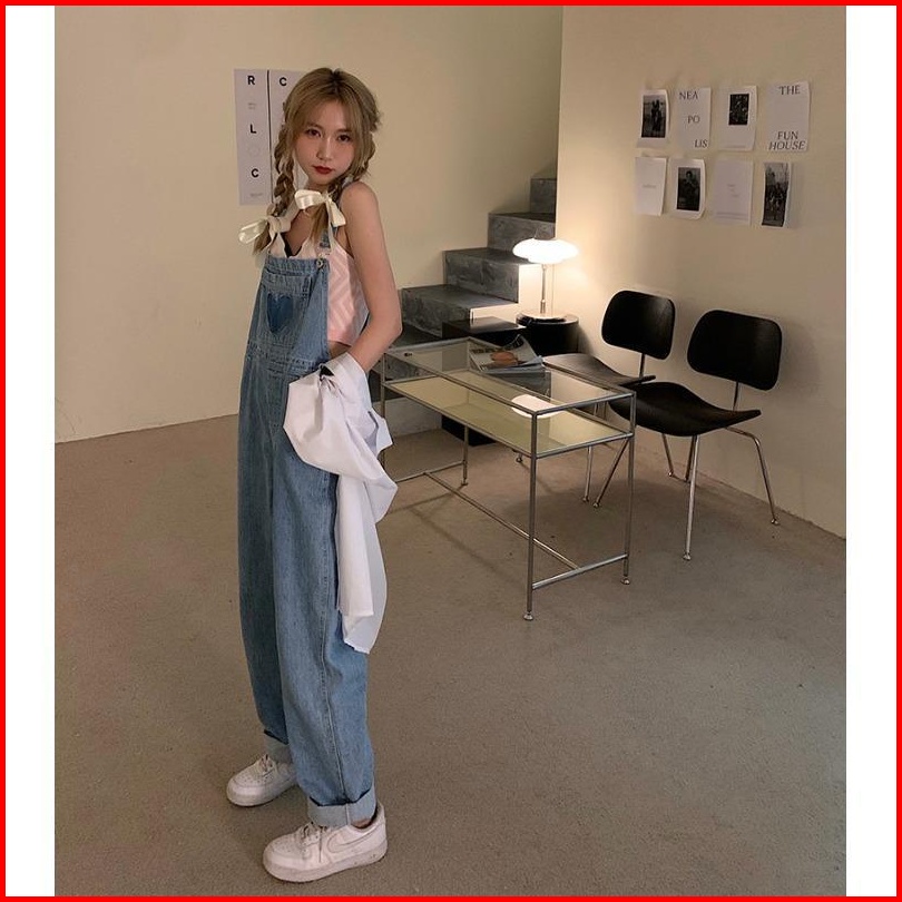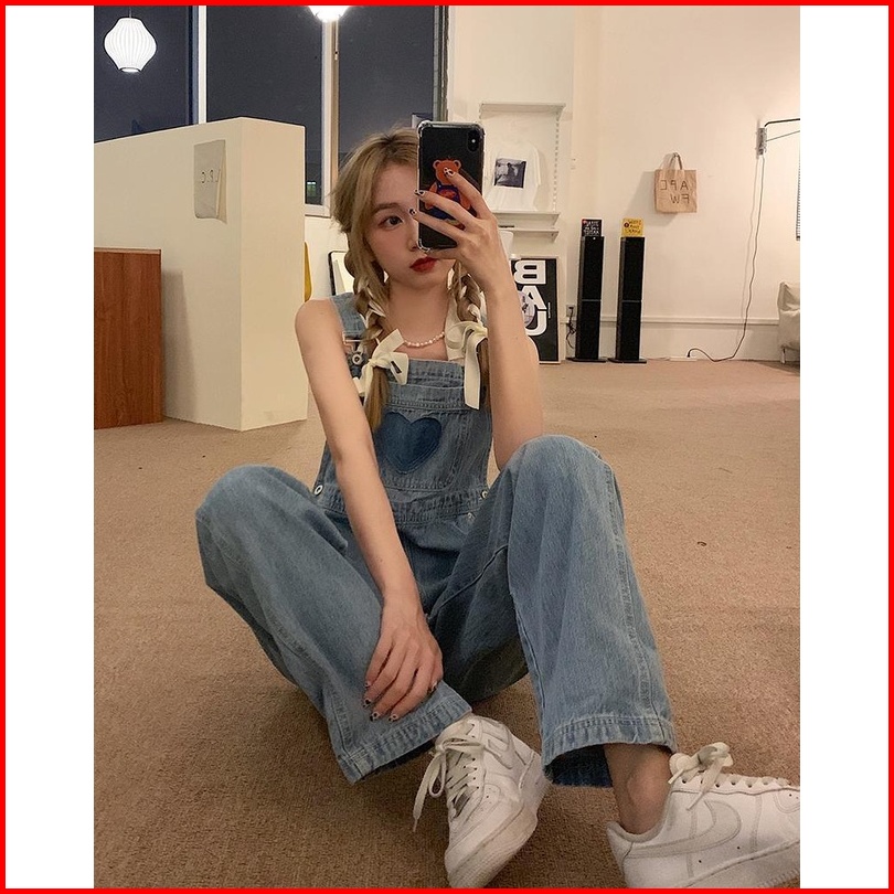 Jumpsuit Motif Love Bordir Celana Kodok Denim Panjang Tali Ikat Celana Wanita Lebar Kaki Celana Jeans