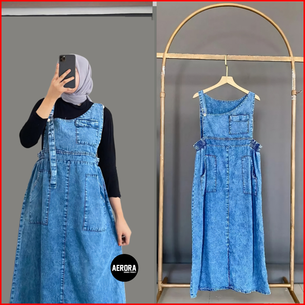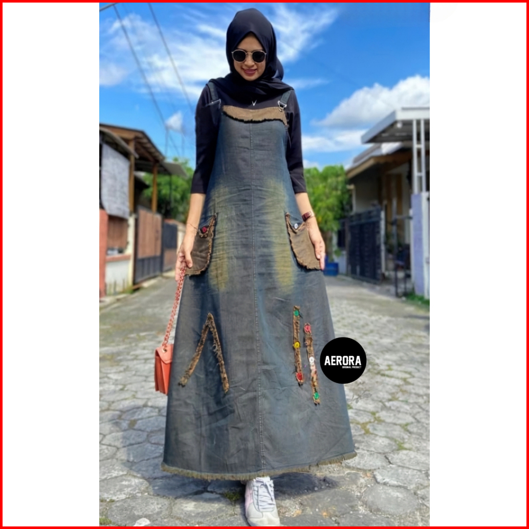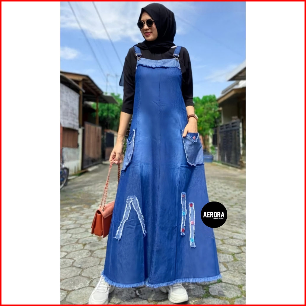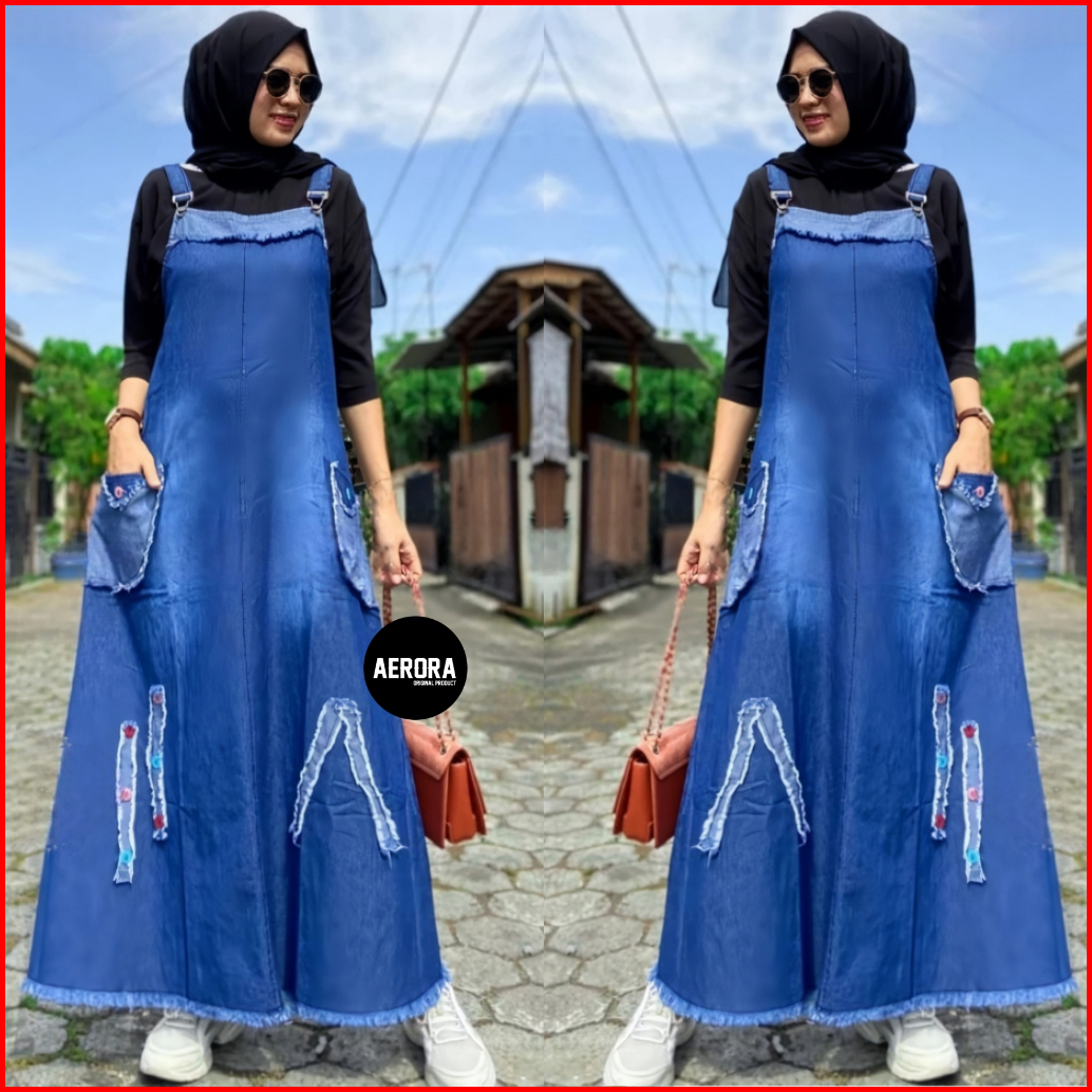 Aerora Baju Kodok Overall Overal Dress Jeans Wanita Motif Bordir Rawis Premium Terbaru 2025 Hima