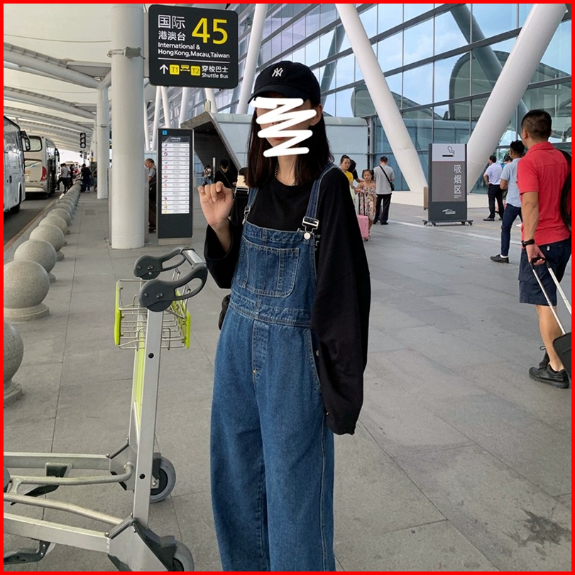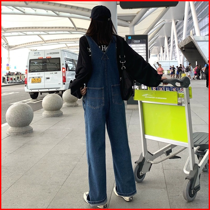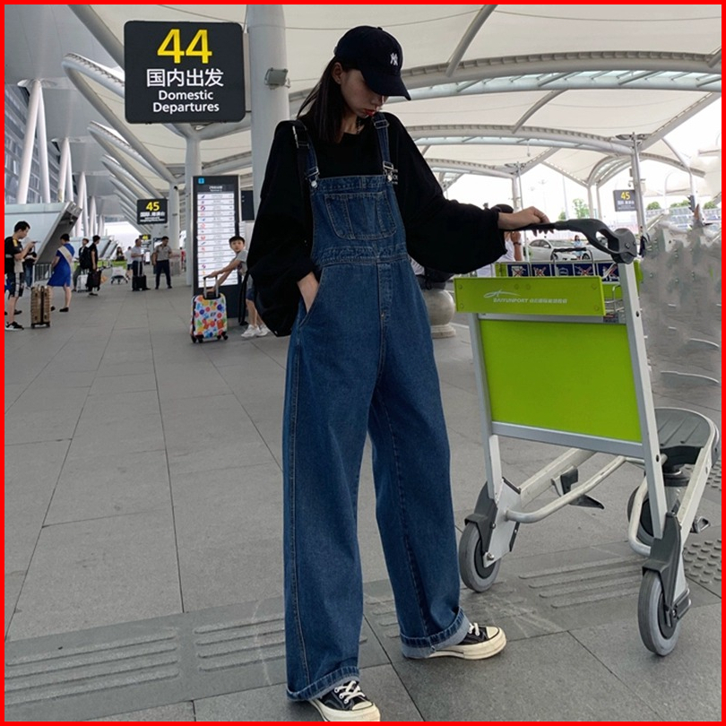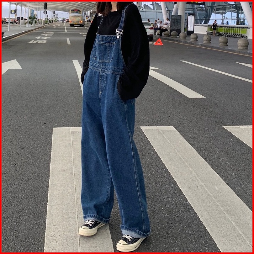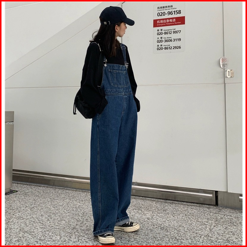 Celana Overall Jeans Wanita Biru Loose Pinggang Celana Kodok Jeans Wanita Kerean Style