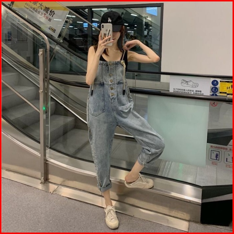 Xj0051 Overall Denim Cropped Kaki Lebar Longgar Wanita