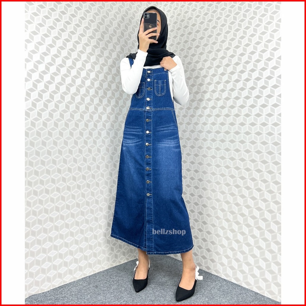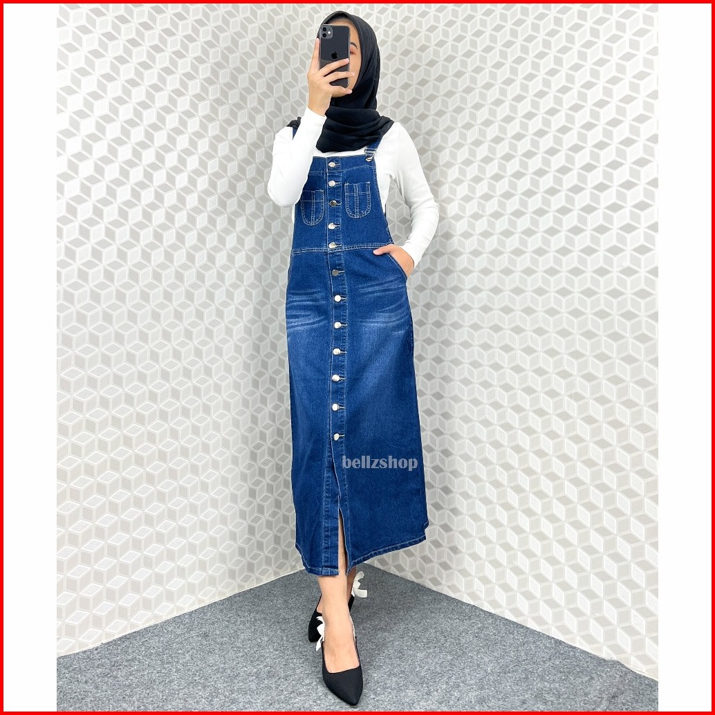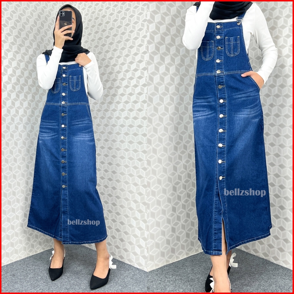 Overall Jeans Rok Panjang Dark Blue Baju Kodok Wanita Premium Safira Size 27 - 34