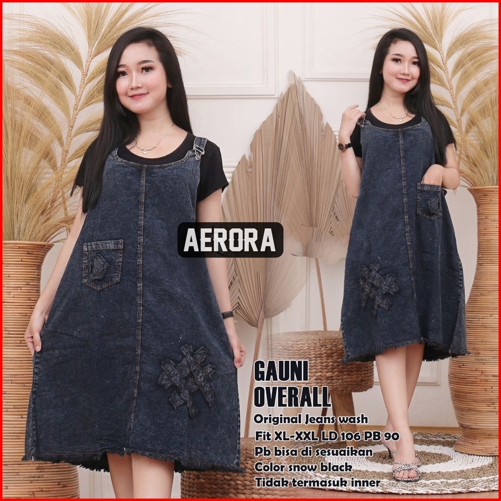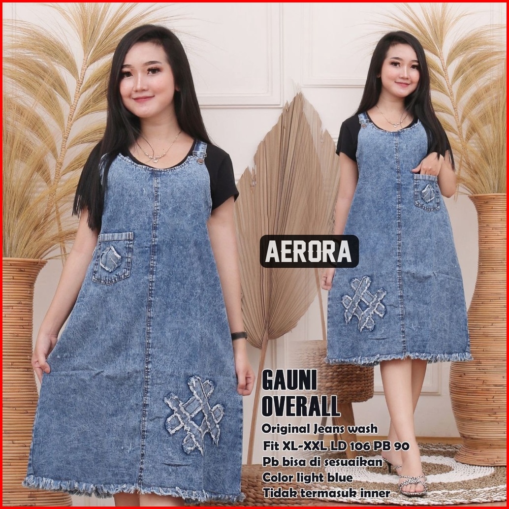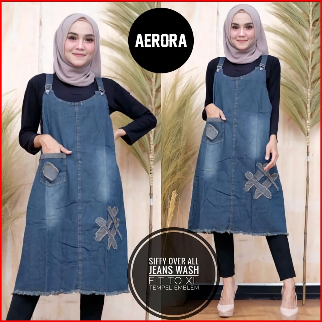Aerora Baju Kodok Overall Dress Jeans Wanita Bordir Tempel Korean Style Kekinian Gauni Allsize