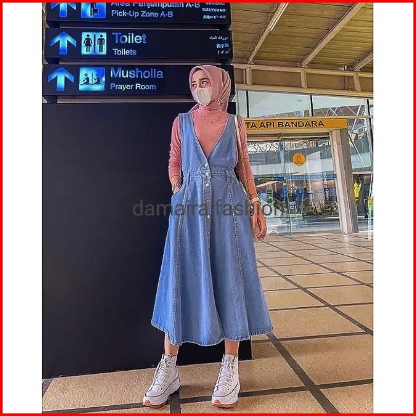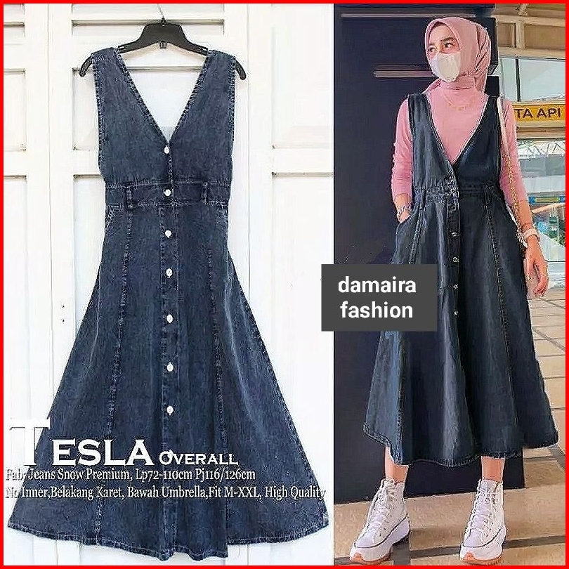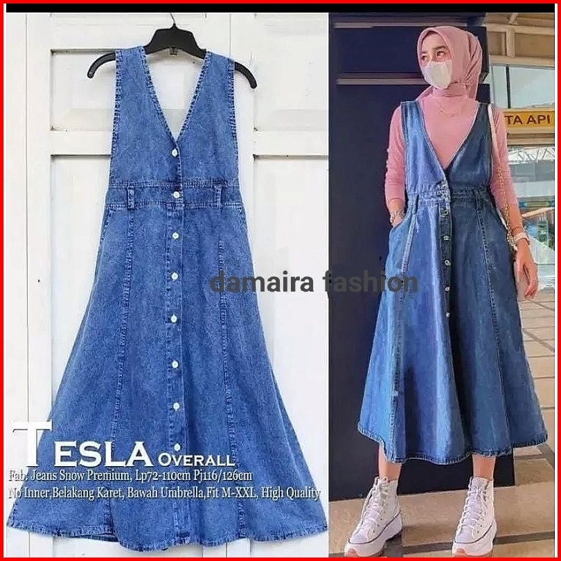 Tesla Overall Rok Kodok Midi Dress Jeans Denim Wanita Jumbo Bigsize
