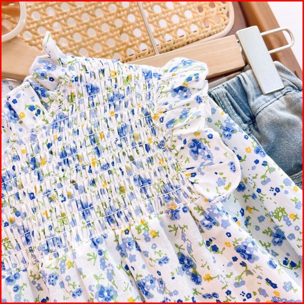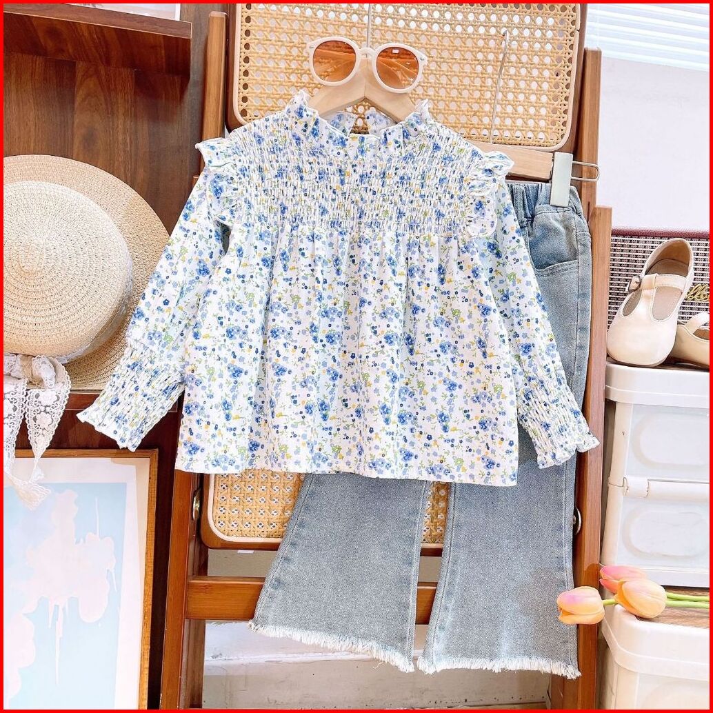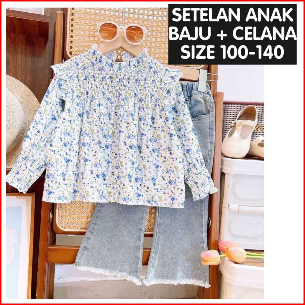 Loli-jkt Bs- 616 Setelan Anak Blouse Bunga Biru Celana Jeans Ctbray Sze 100-140