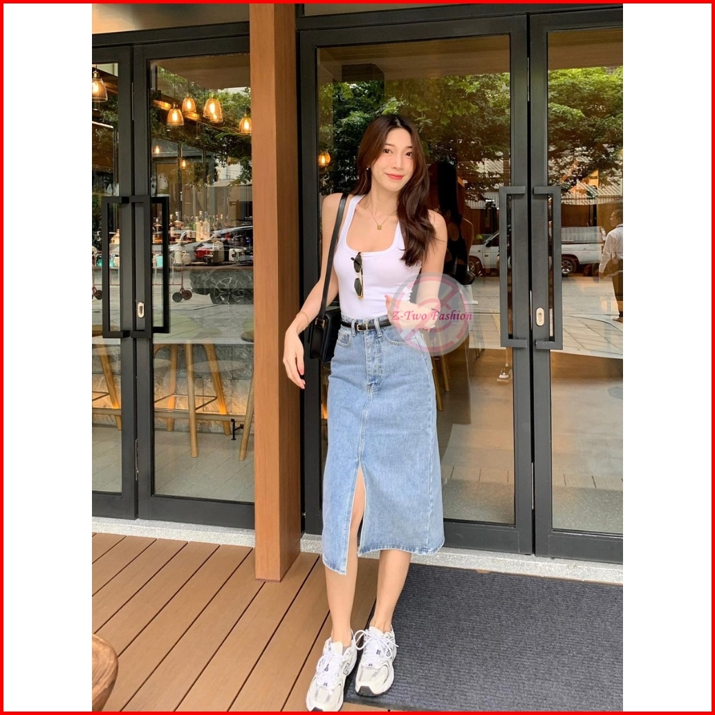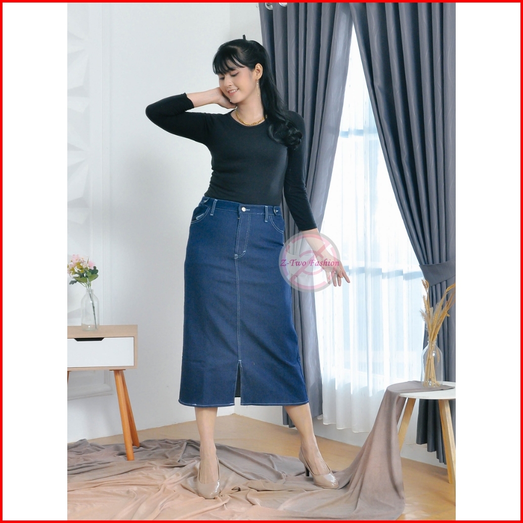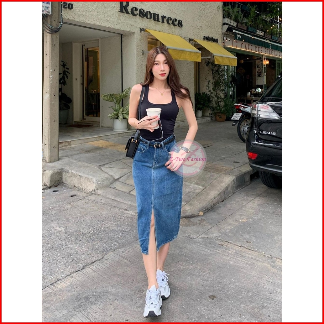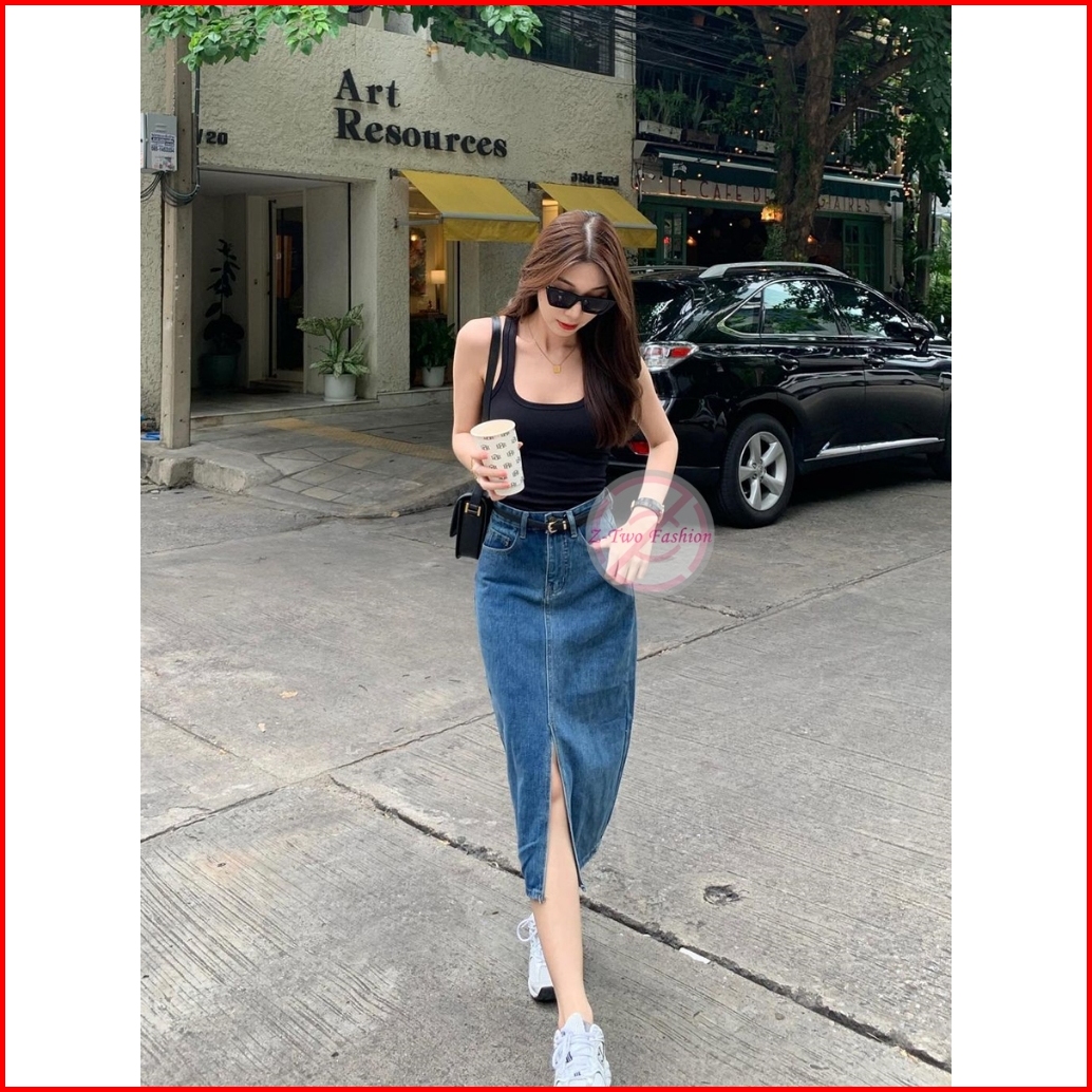 Z-two Fashion Bunny Skirt - Rok Jeans Panjang 7 8 Highwaist A Line Wanita Korean Style Belah Depan