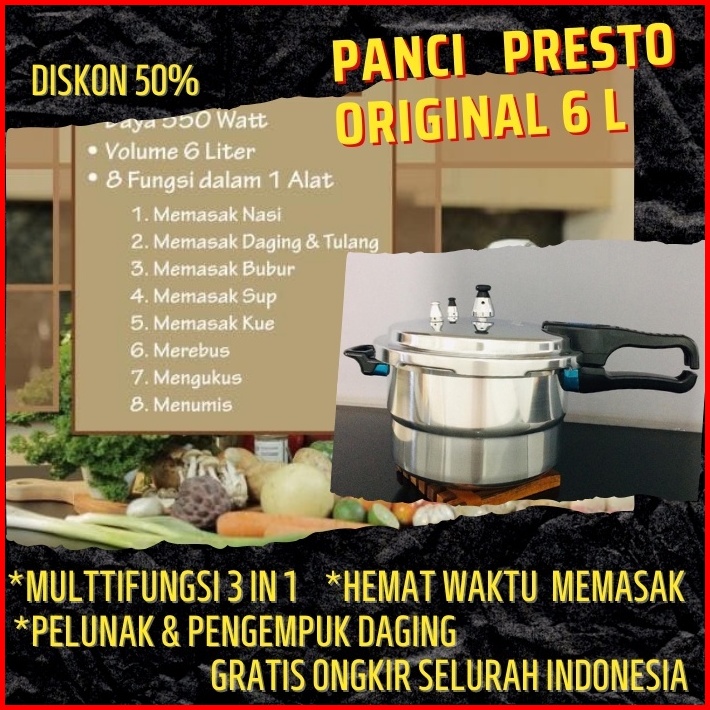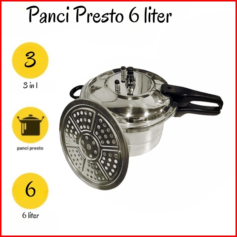 Panci Presto 6 Liter 3 In 1 22 Cm Pressure Cooker Pelunak Daging Presto Original Serbaguna