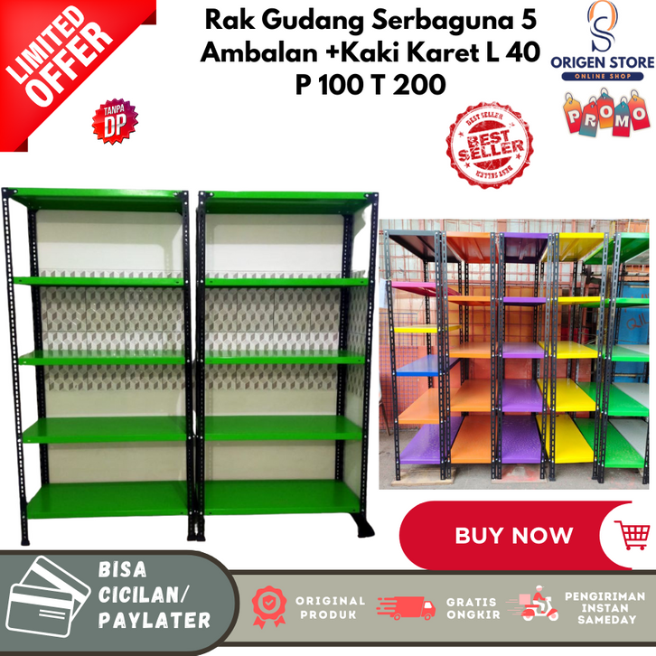 FREE ONGKIR Rak Gudang Serbaguna 5 Ambalan +Kaki Karet L 40 P 100 T 200