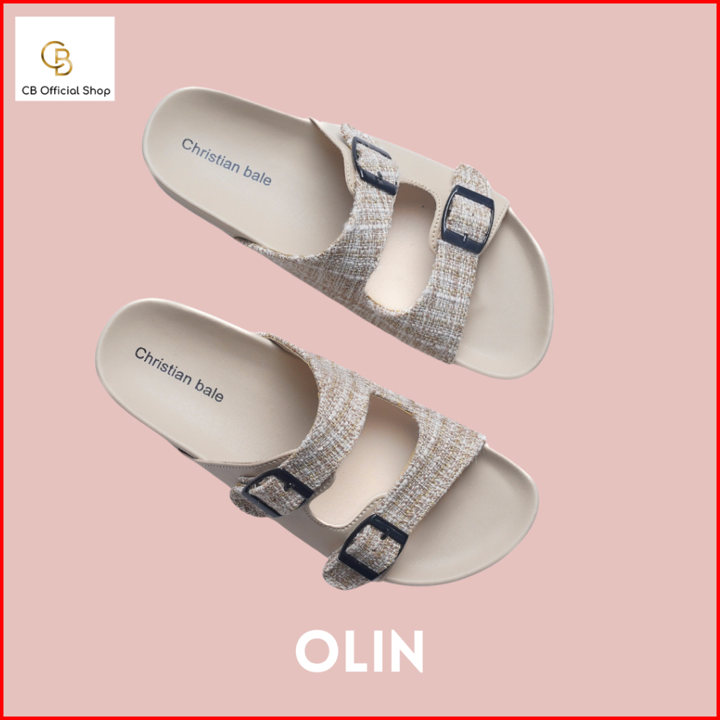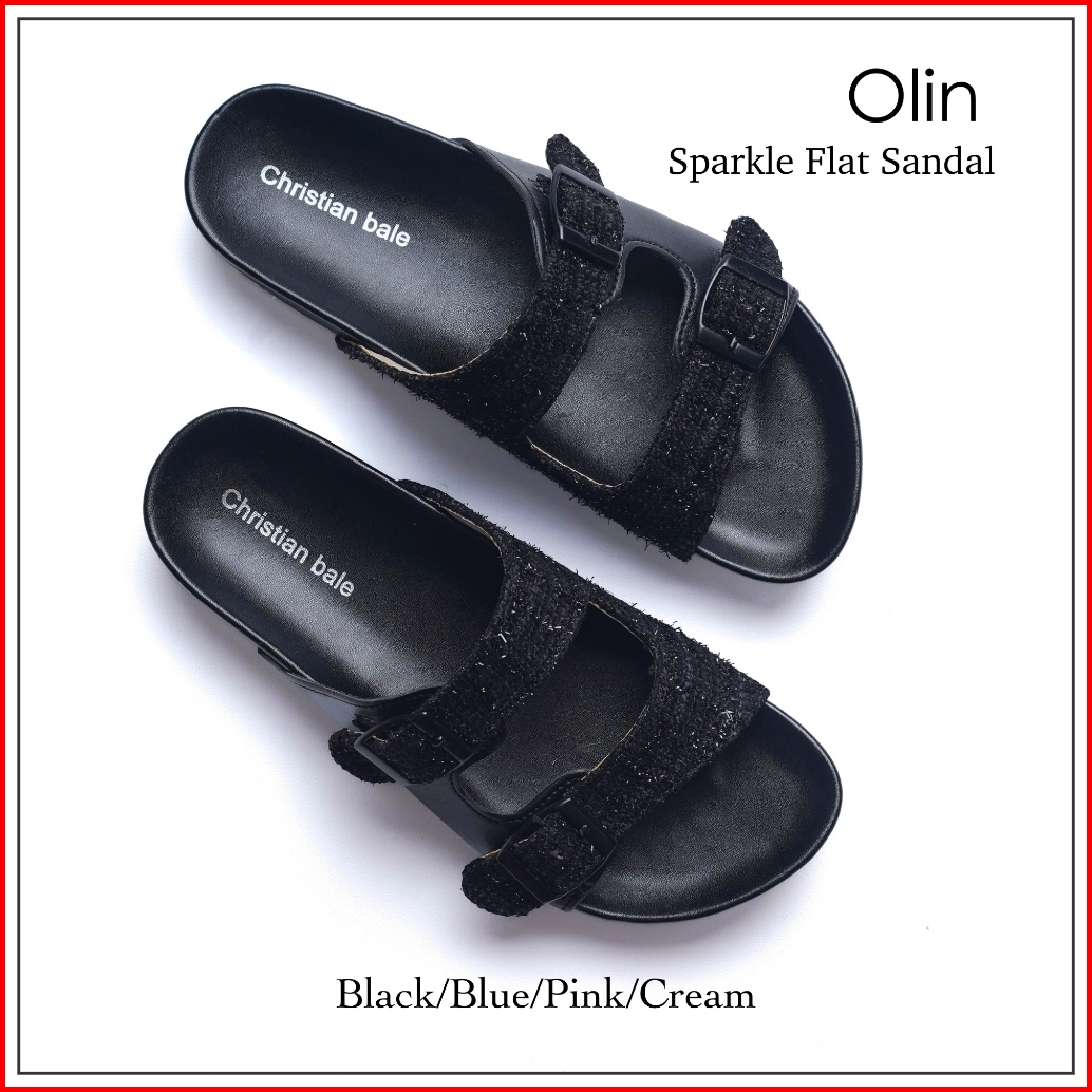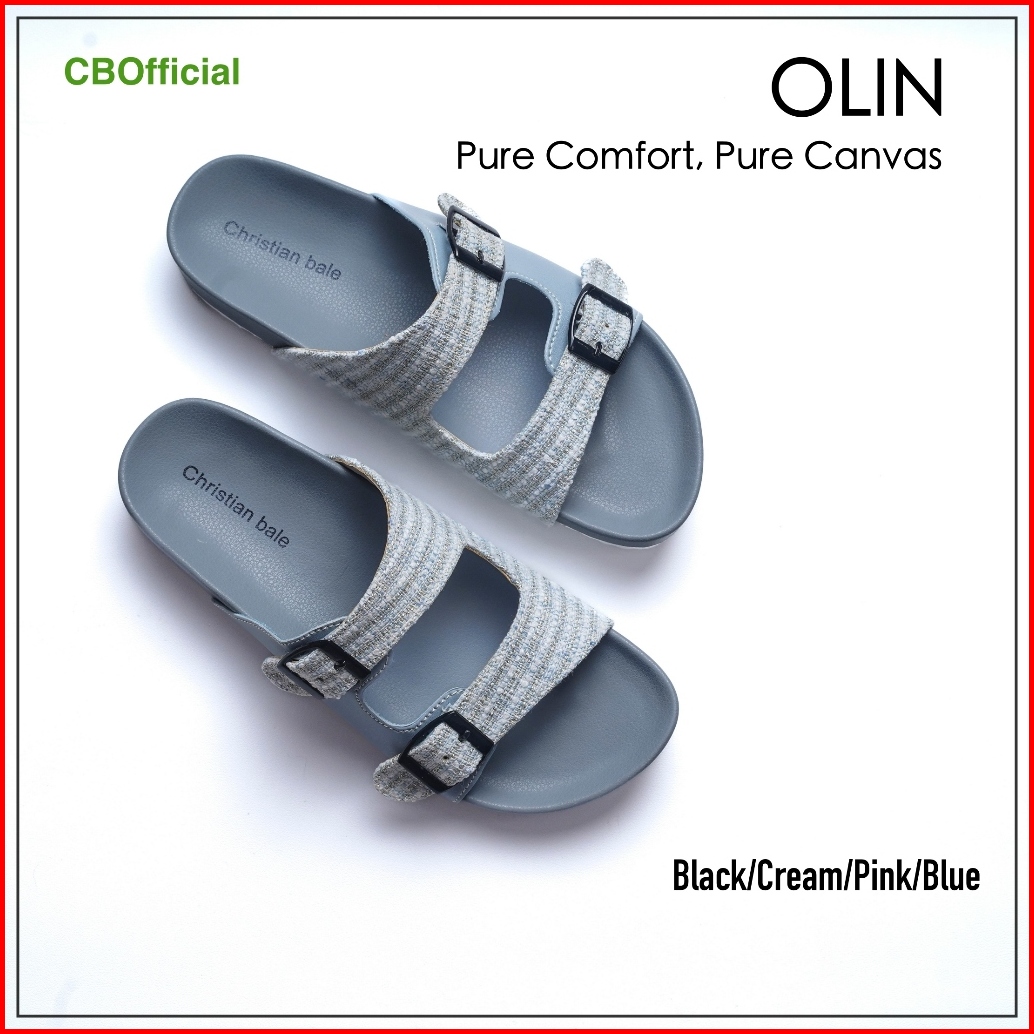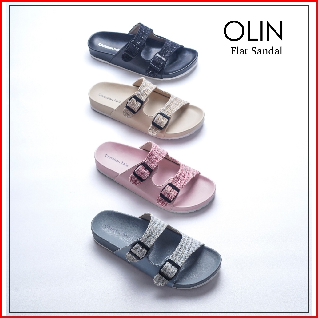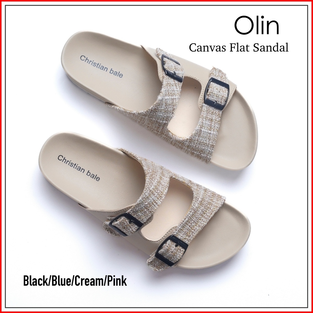 Christian Bale Olin Sandal Wanita Kekinian Sendal Flat Cewek Slop Casual Kanvas Gesper Terbaru