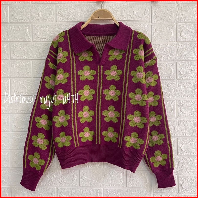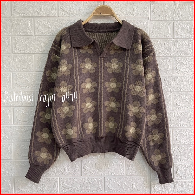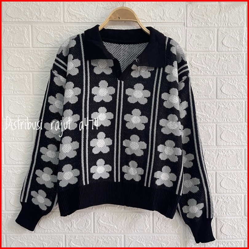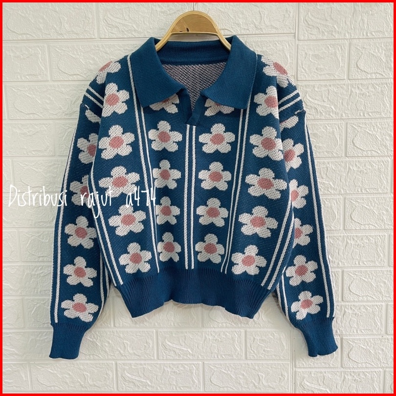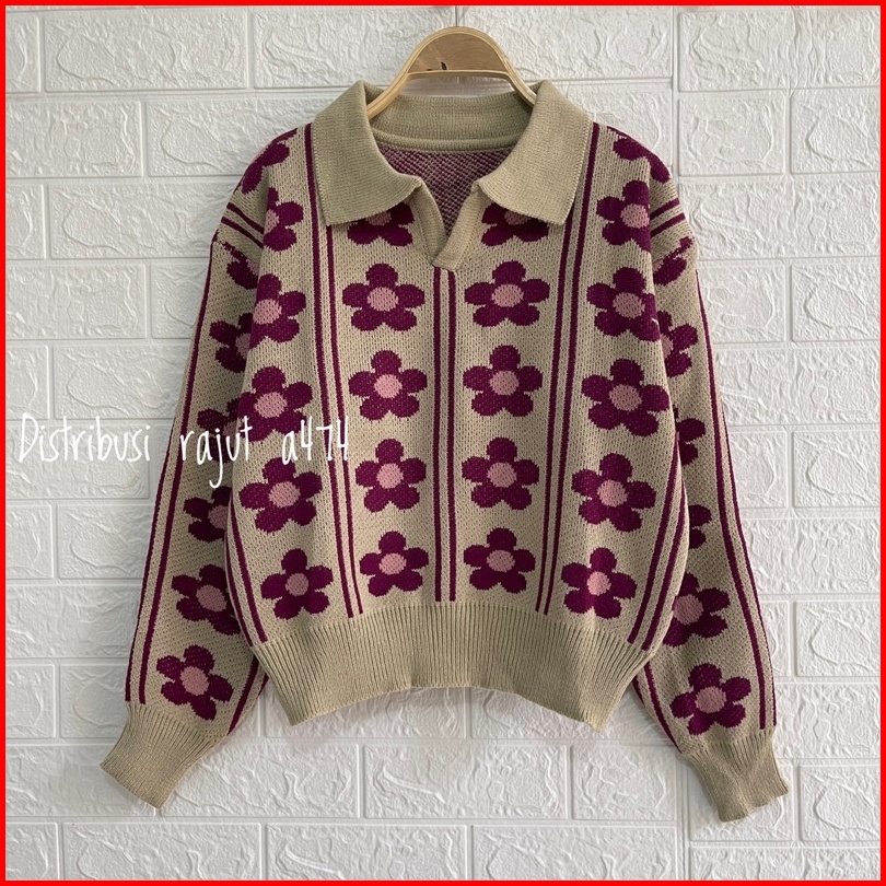 Sweater Rajut Polo Kerah Agnes Motif Bunga Wanita