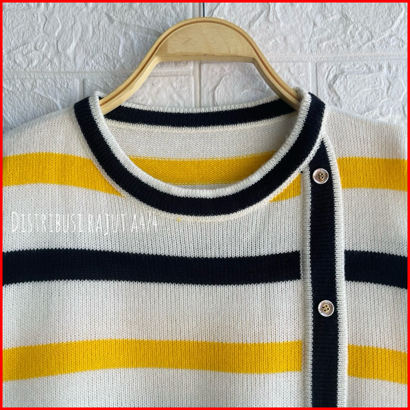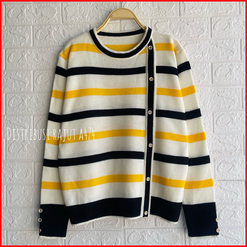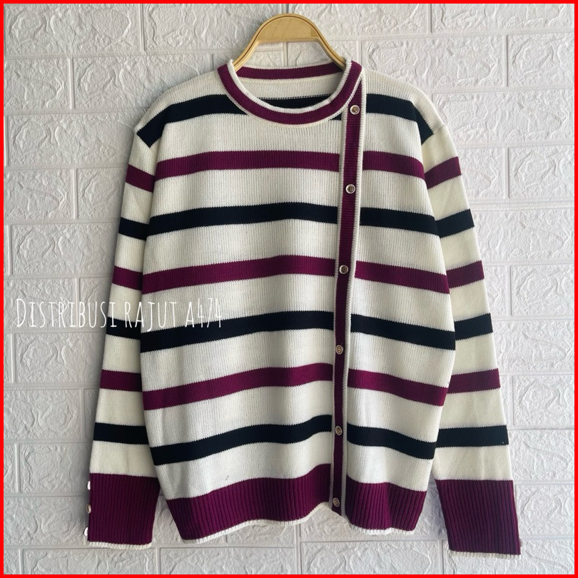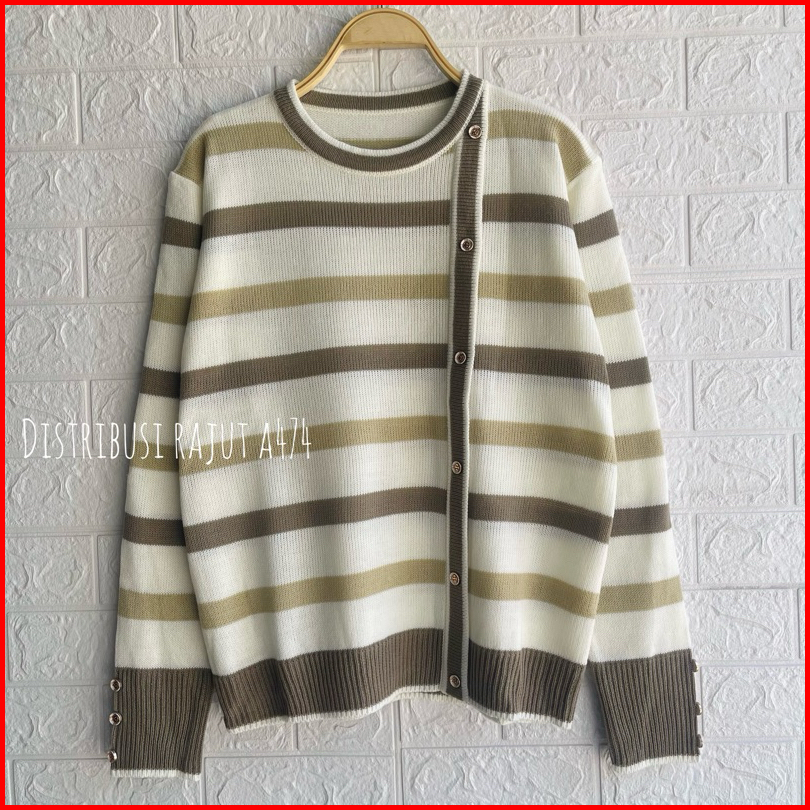 Qinara Sweater Rajut Motif Stripe Kancing Kerah Bulat Wanita Lengan Panjang