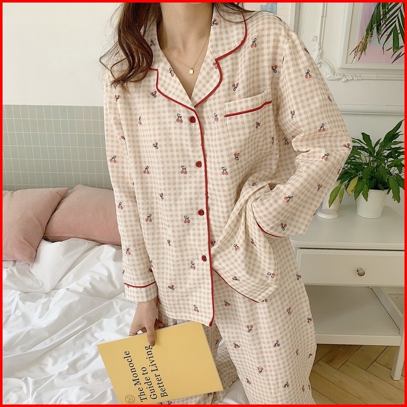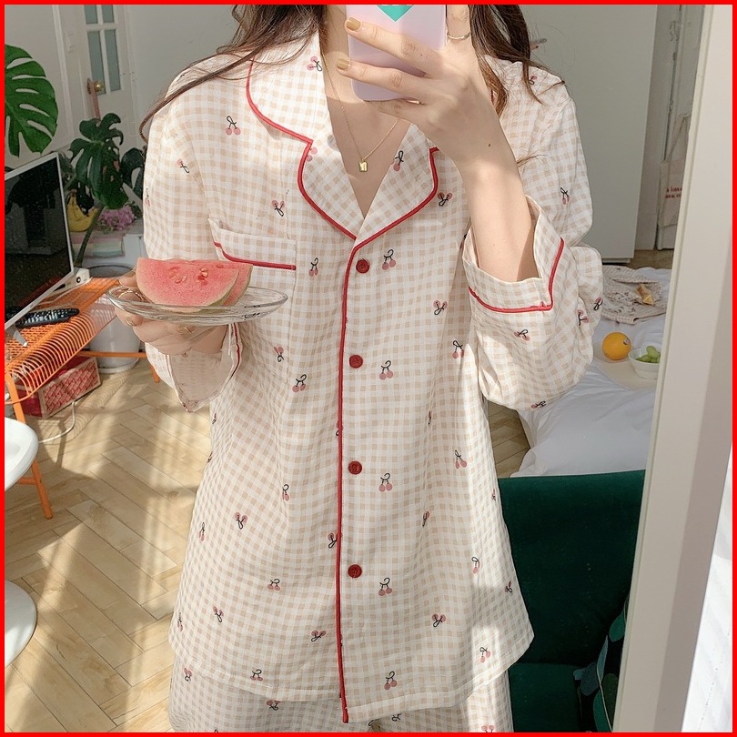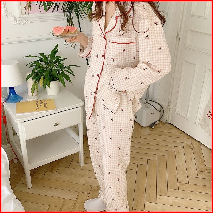 Shin Ri Sleepwear Baju Tidur Piyama Wanita Lengan Panjang Celana Panjang Motif Cherry Import Setelan Aesthetic