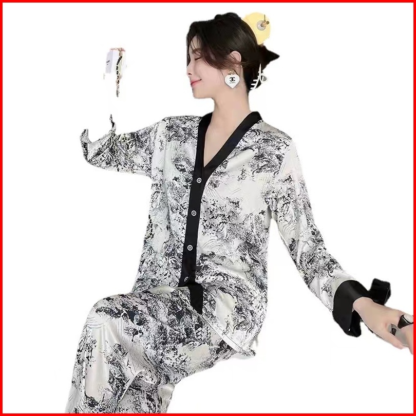 2025 Versi Korea Baru Pakaian Rumah Tipis Lukisan Tinta Ice Silk Long -sleeved Long -sleeved Piyama Set