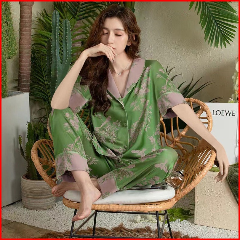 2025 Piyama Baru Wanita Es Sutra Kardigan Dingin Berkualitas Tinggi Set Pakaian Rumah Wanita