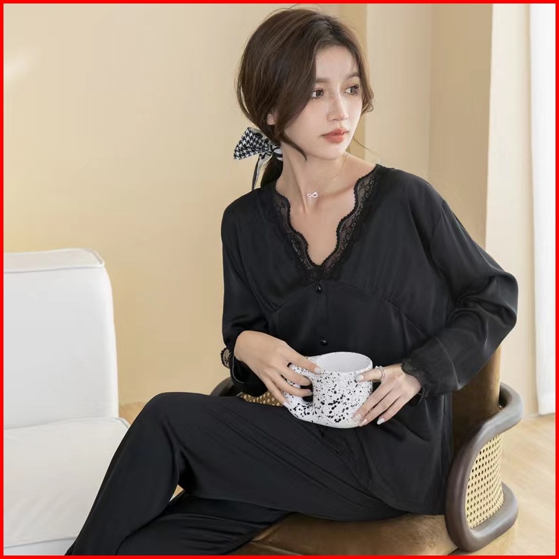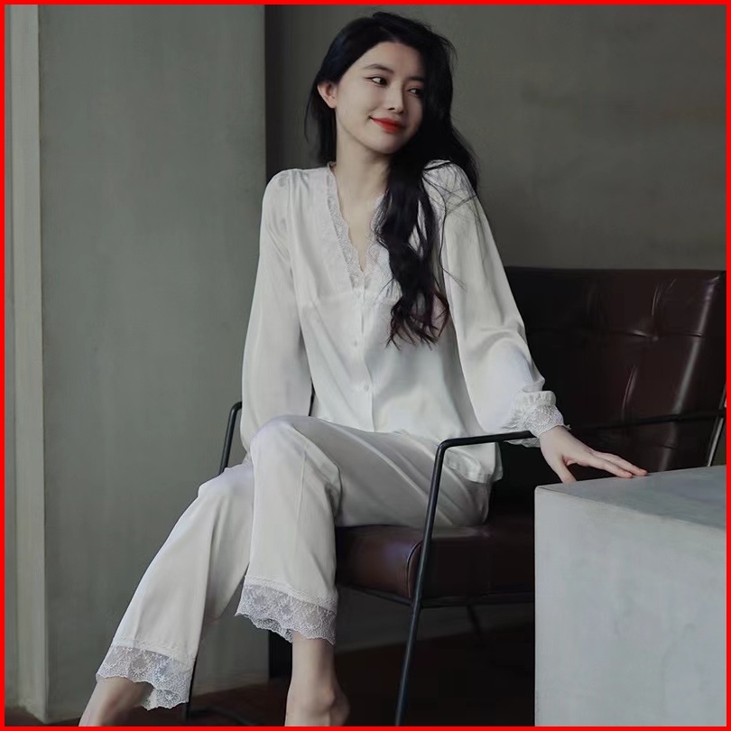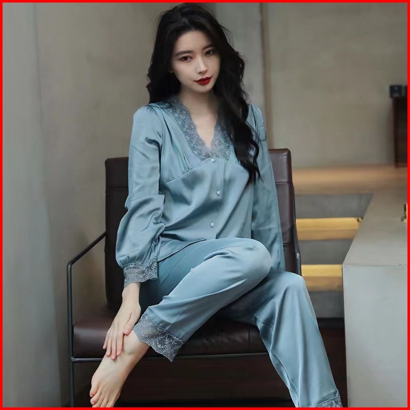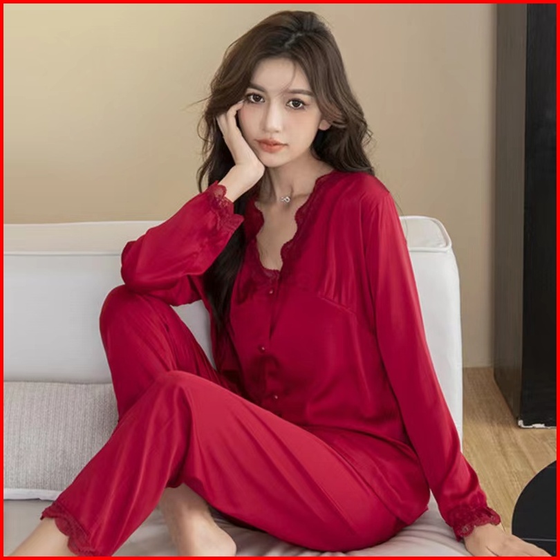 2024 Baru Piyama Wanita Es Sutra Renda Seksi Sutra Lengan Panjang Net Merah Ins Gaya Dua Potong Layanan Rumah