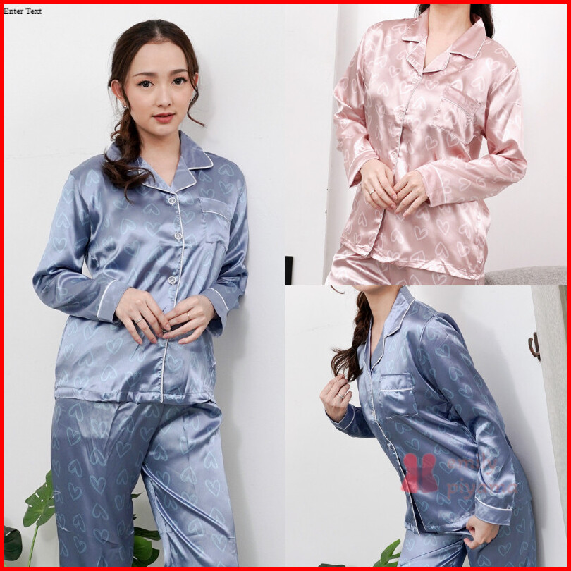 Emily Piyama Baju Tidur Set Piyama Model Icon Love Kemeja Bahan Satin Lengan Panjang Celana Panjang Premium Pakaian Tidu
