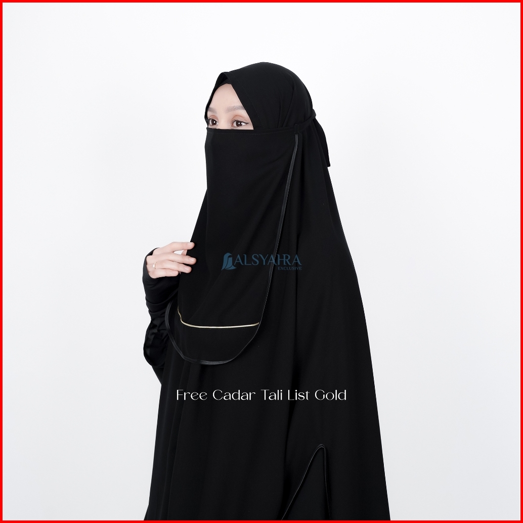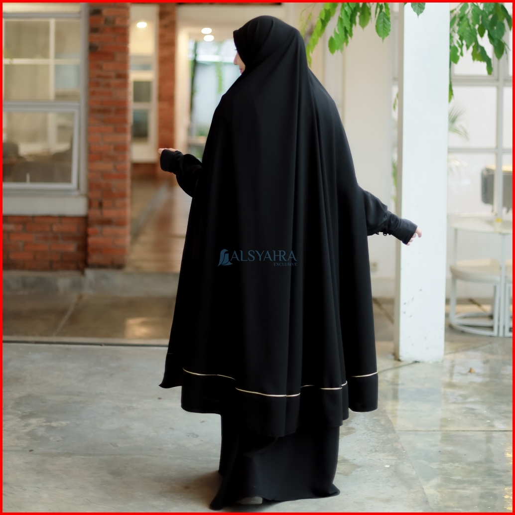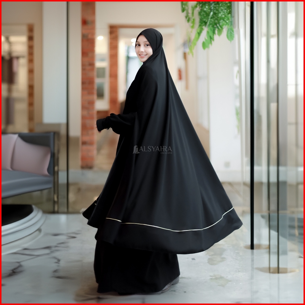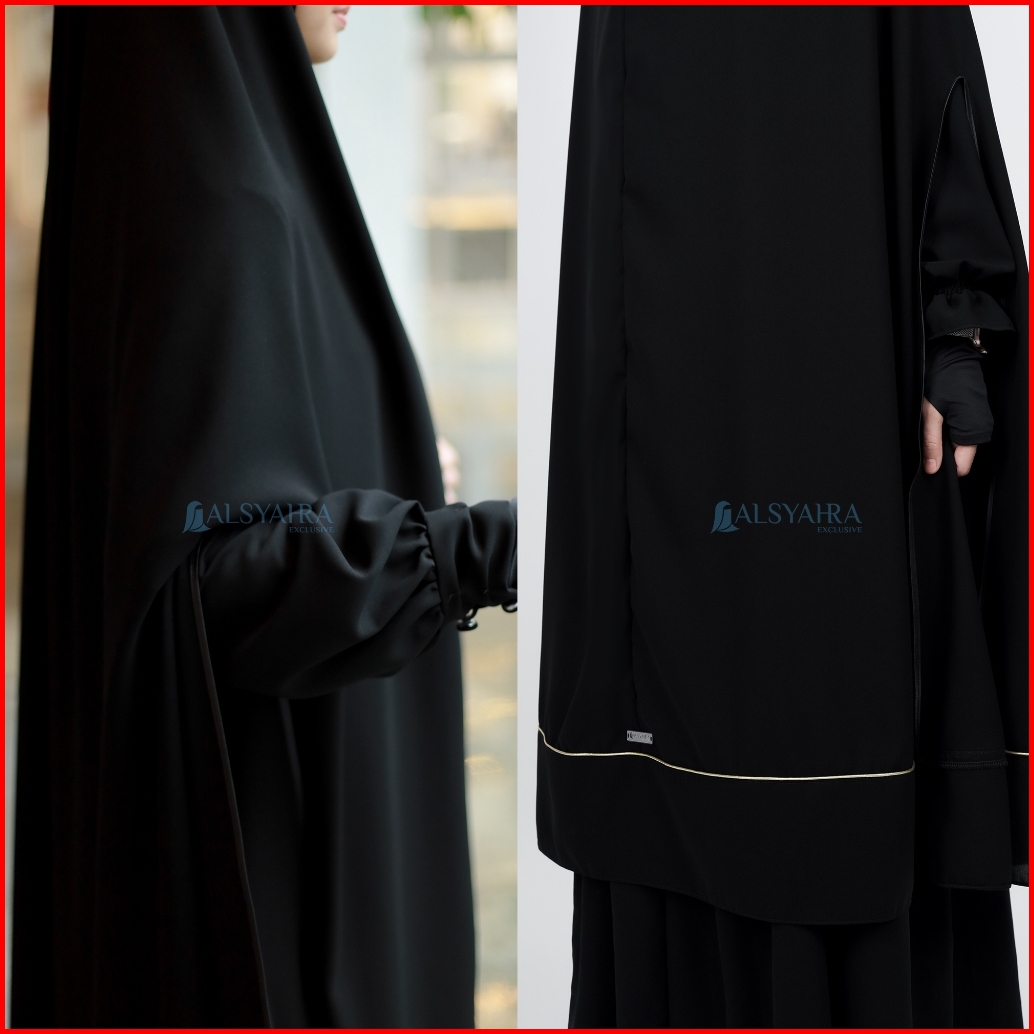 Alsyahra Exclusive - Set Long Khimar Syari Handsplit List Haramain Cadar Tali Jetblack