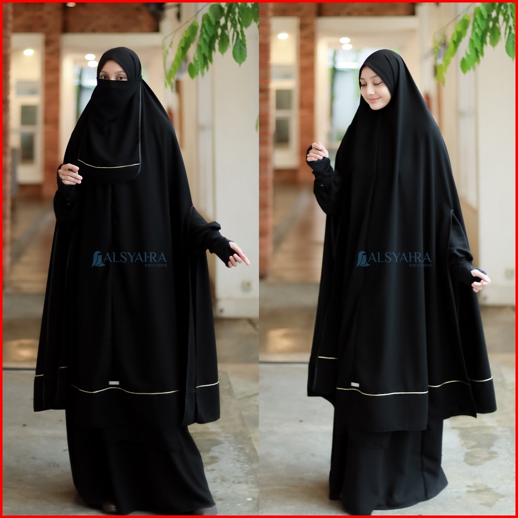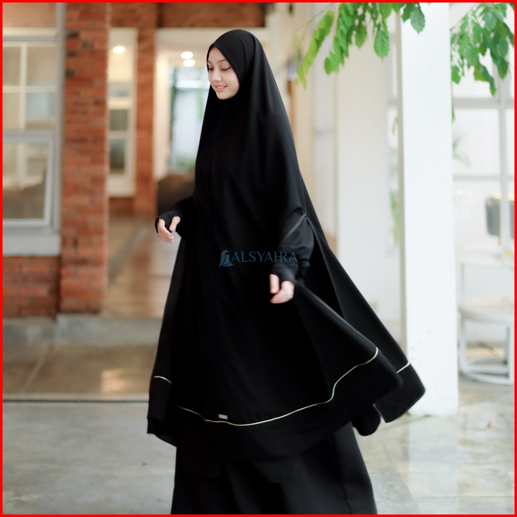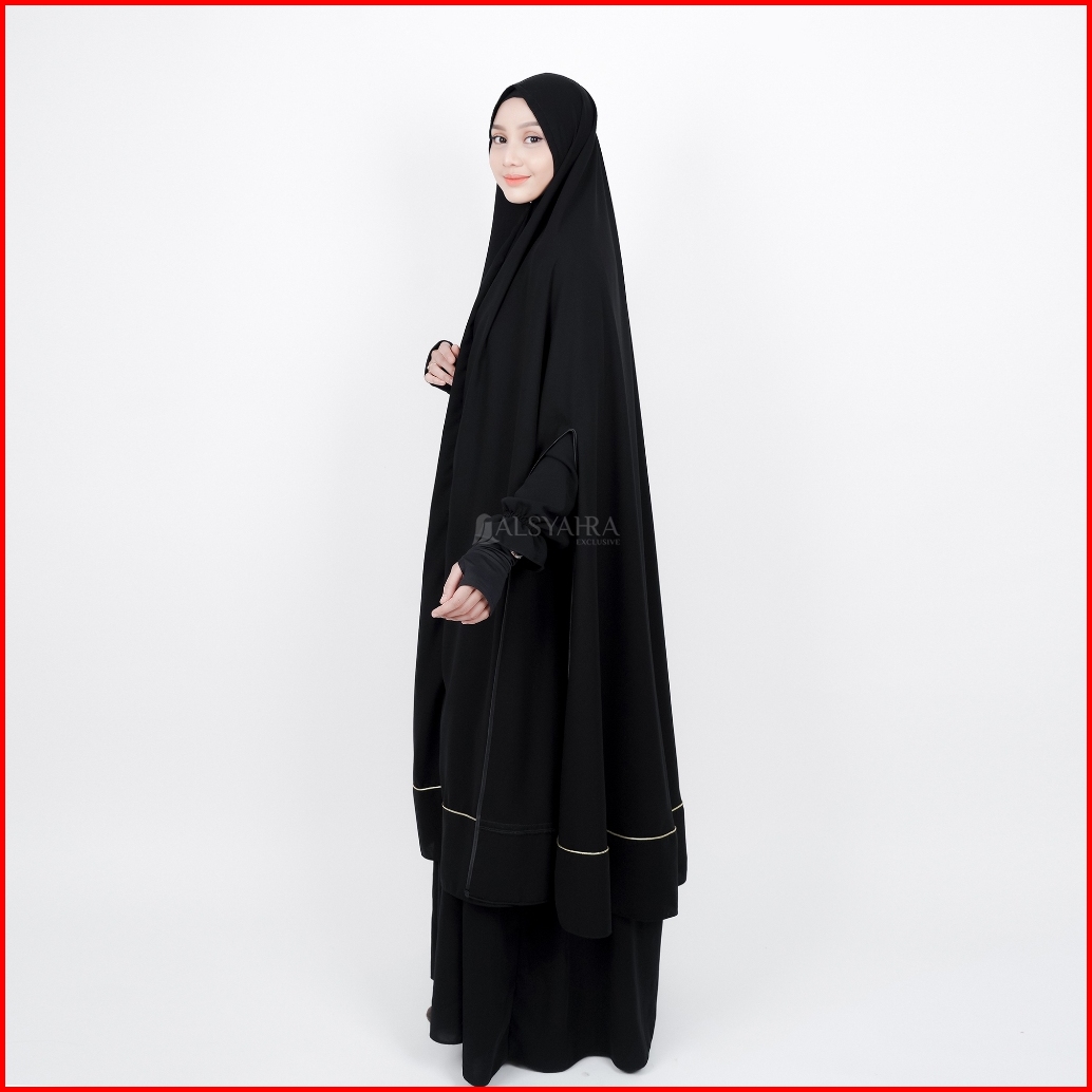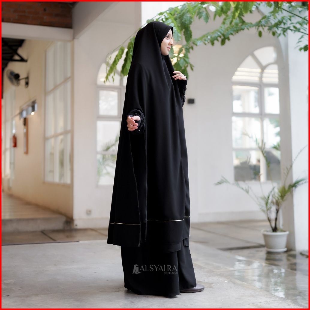 Alsyahra Exclusive - Set Long Khimar Syari Handsplit List Haramain Cadar Tali Jetblack