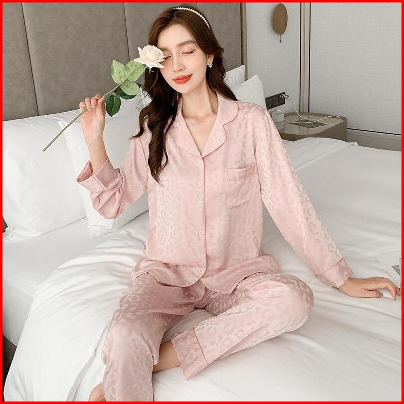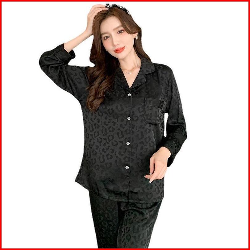 028 Ultra Luxury Sleepwear Kelas Atas Piyama Satin Lengan Panjang Celana Panjang Motif Leopard Kancing Hidup Satin High