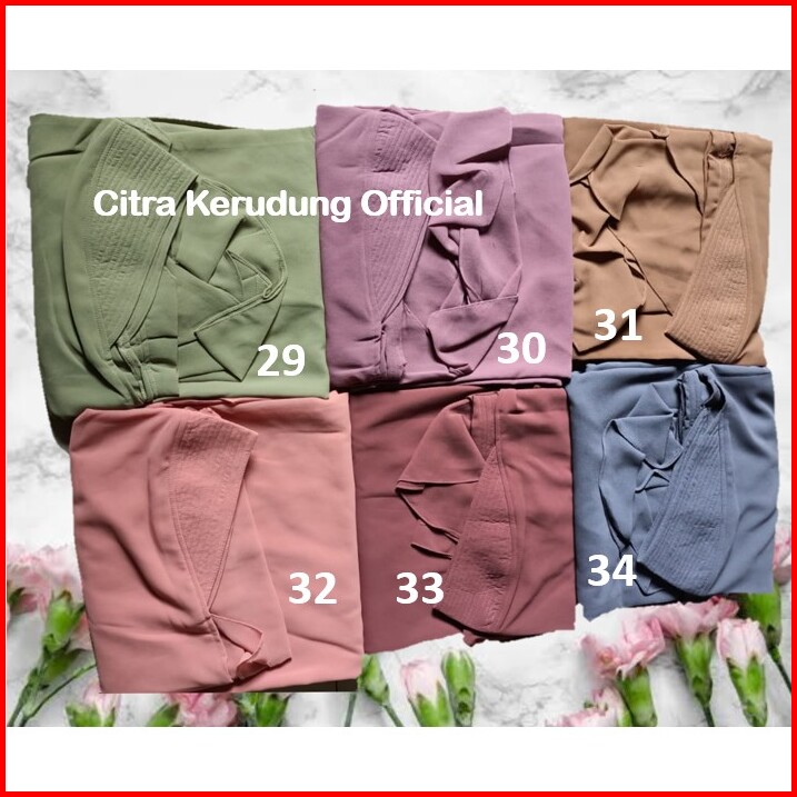 Hitam, Putih bw, Mocca, Coksu, Taupe Gray, Coklat Karamel, Coklat Tua, Silver, Abu Tua, Merah Tua, Army Green, Tawny, Dusty Pink, Baby Pink, Navy, Ijo Botol, Lavender., Salem, Hijau mint, Ijo sage, Putih Bersih, Ijo wardah, Taupe, Mauve, Lemon, Kuning busuk, Choco peach, Kunyit, Lilac, Golden rood, Maroon, Hijau Pupus