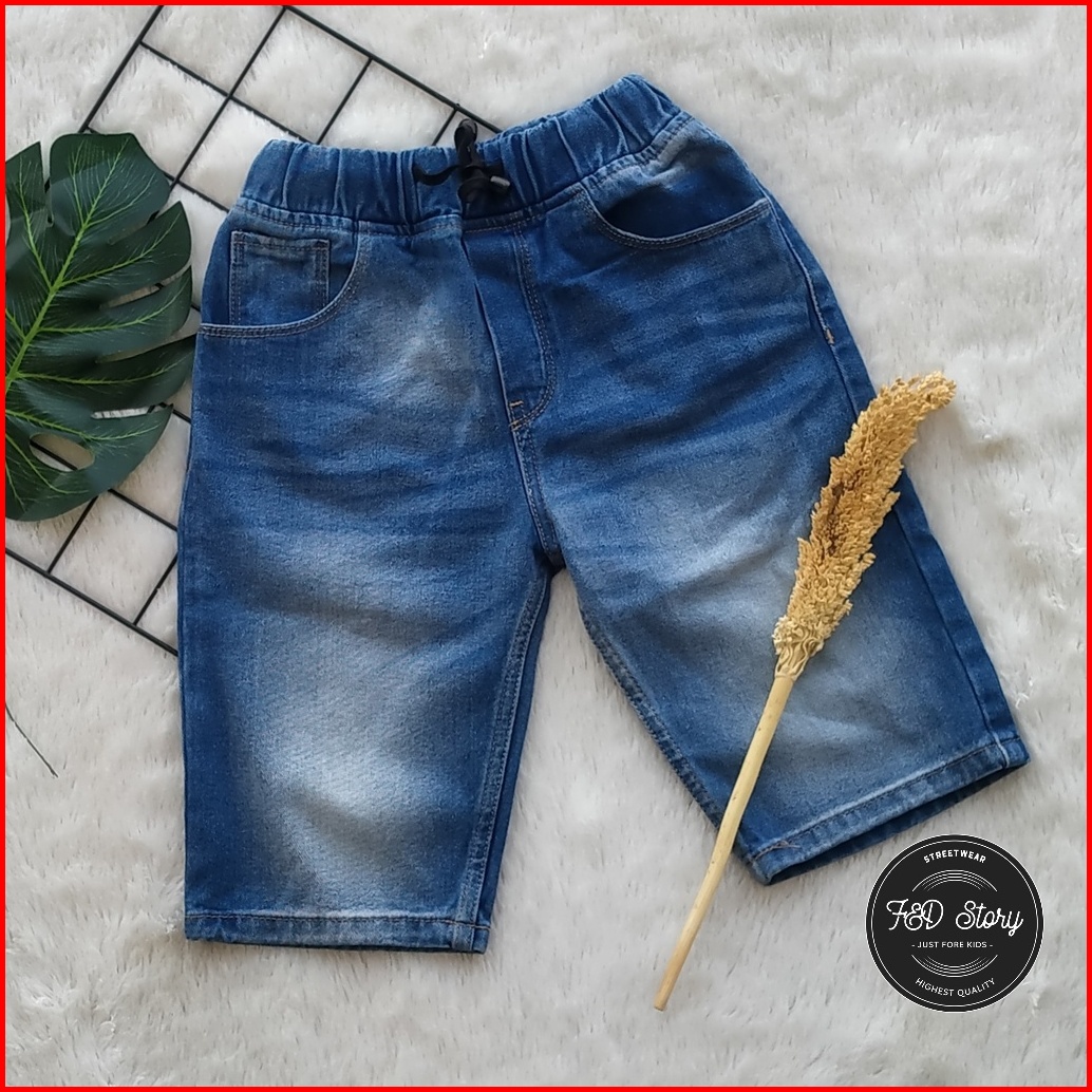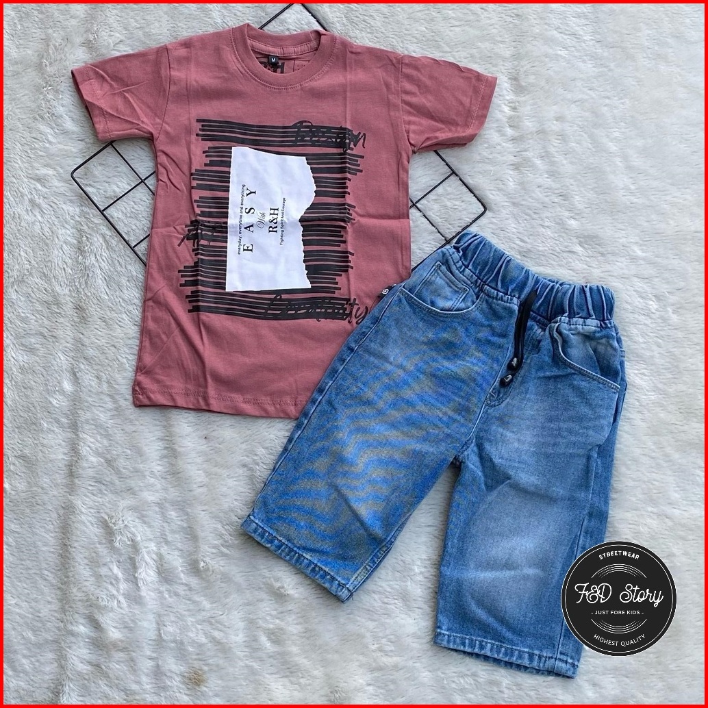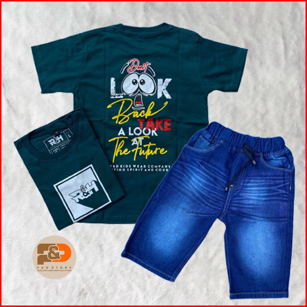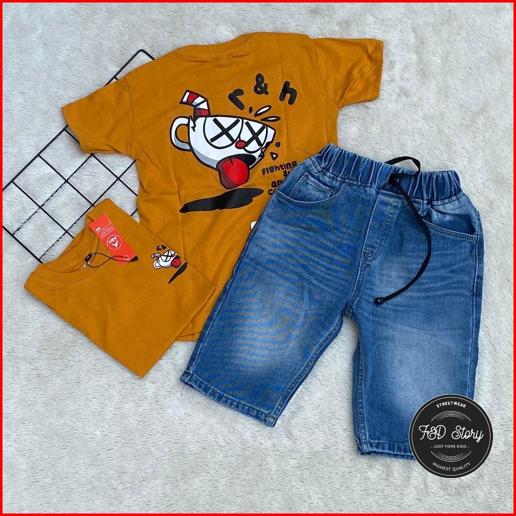 Setelan Baju Kaos Distro Anak Unisex Bahan Cotton Celana Pendek Bahan Jeans Usia 4-12 Tahun